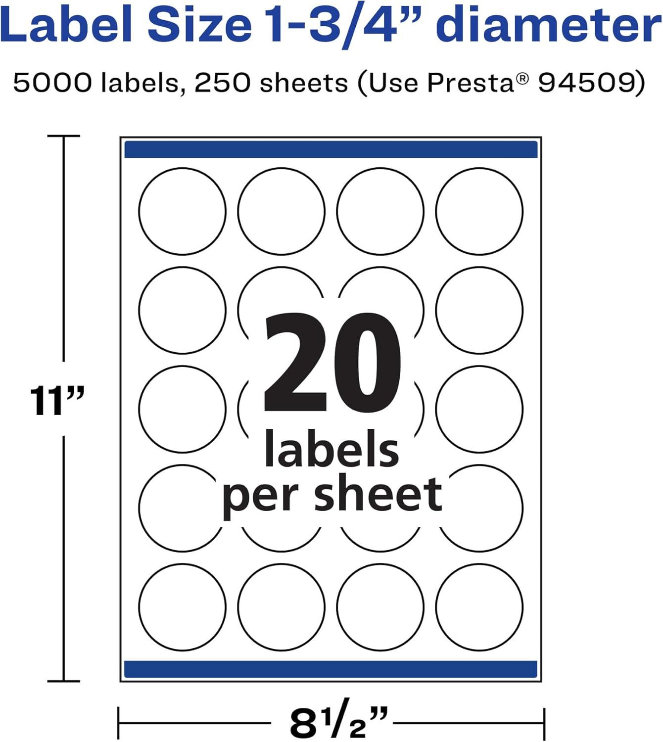 Avery Matte White Round Labels, Sure Feed Technology, 1.75" Diameter, 500 Matte White Printable Labels(5 000 Labels)