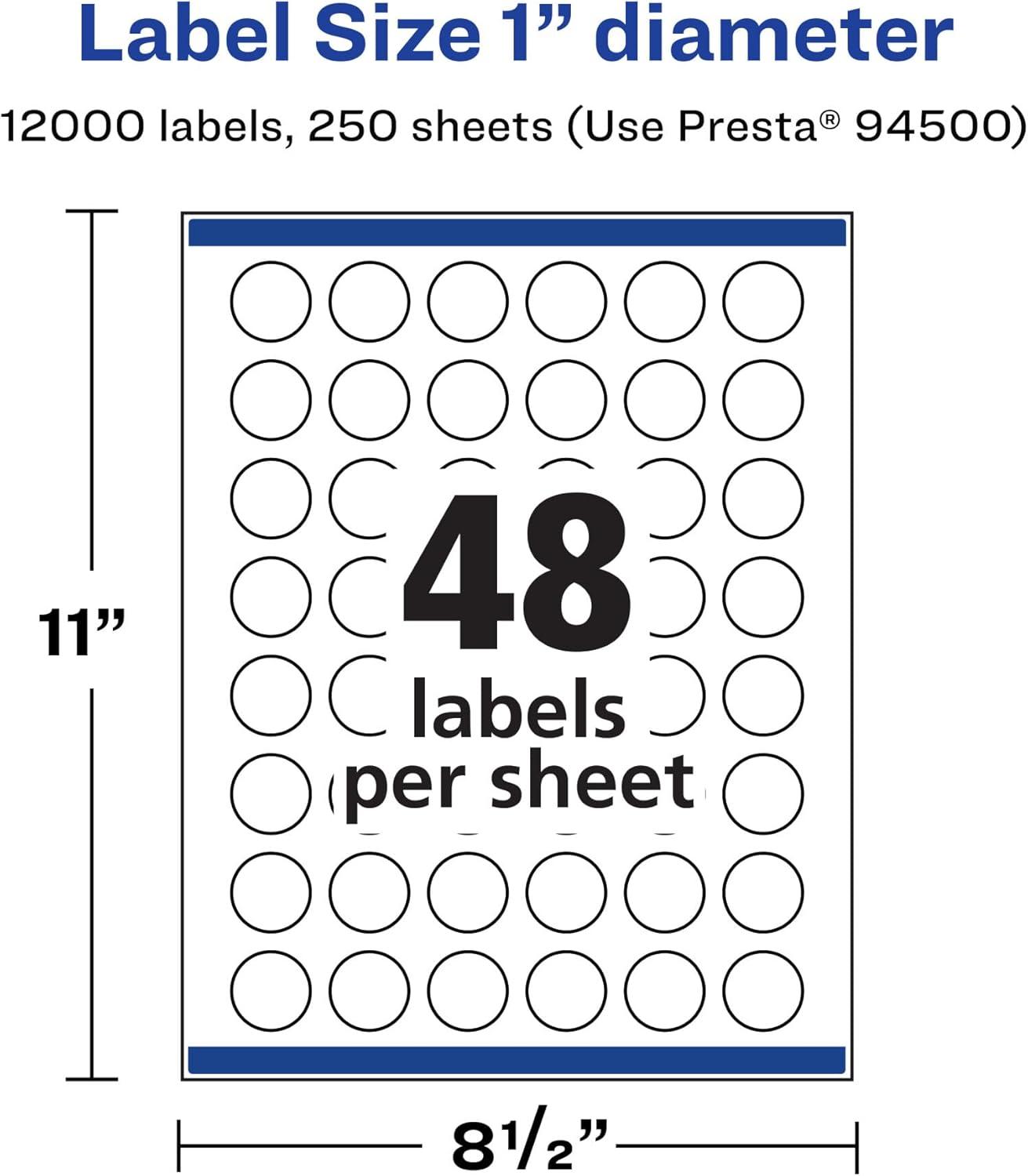 Avery Matte White Round Labels, Sure Feed Technology, 1" Diameter, 1,200 Matte White Printable Labels(12 000 Labels)