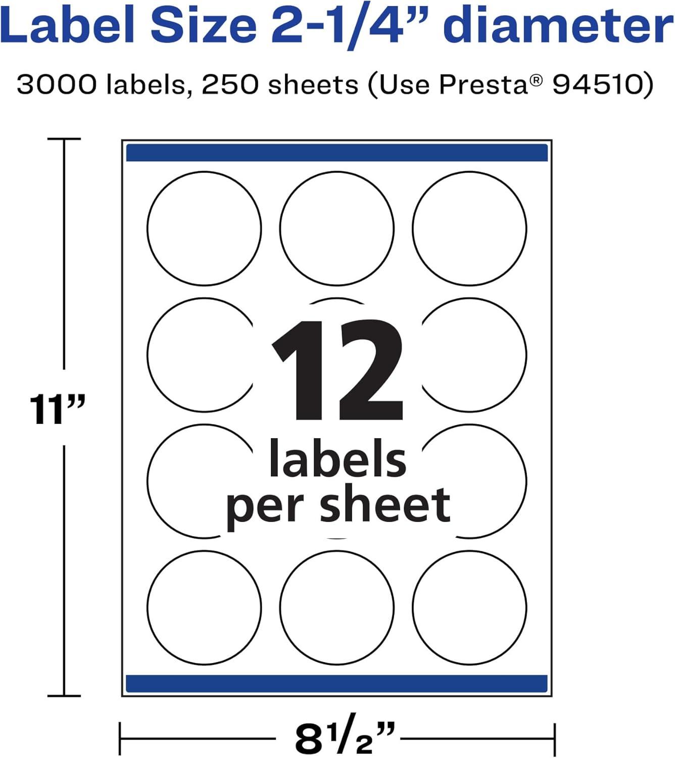 Avery Matte White Round Labels, Sure Feed Technology, 2.25" Diameter, 300 Matte White Printable Labels(3000 Labels)