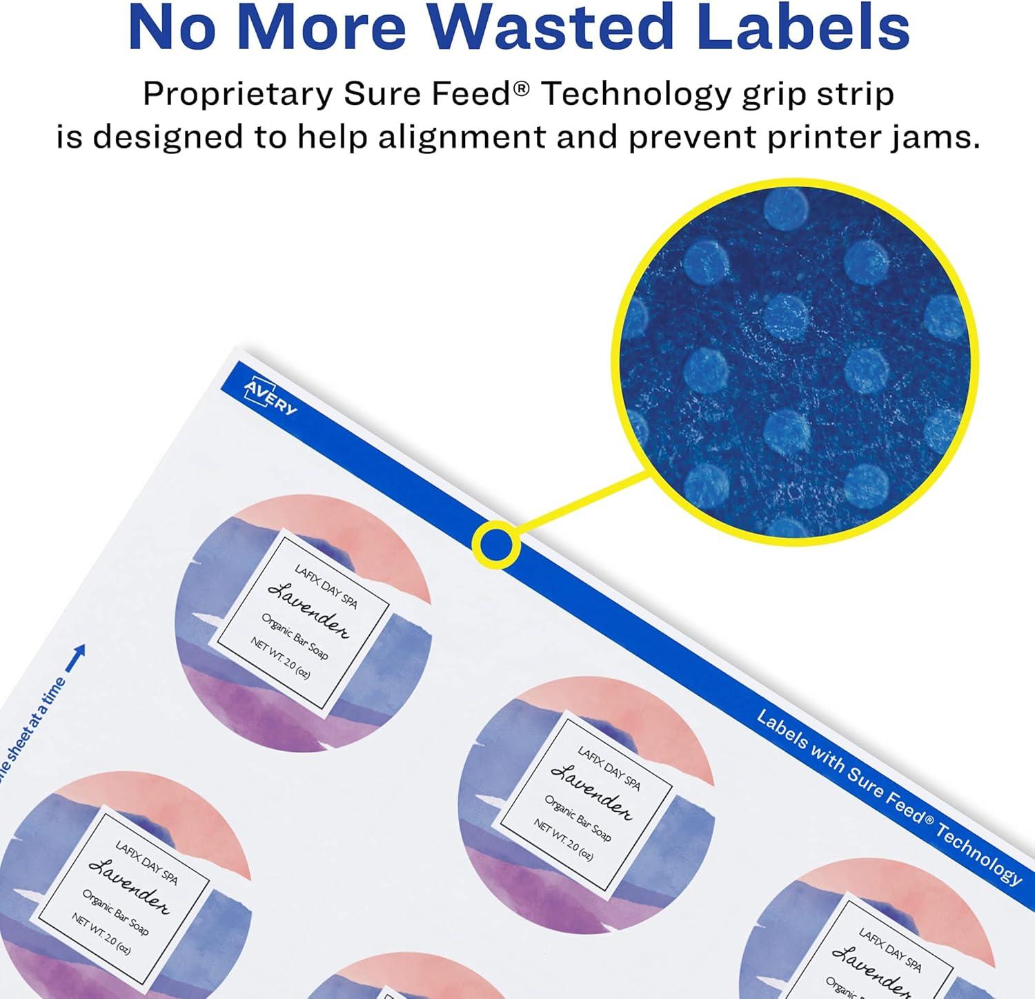 Avery white labels with proprietary Sure Feed technology provide a more reliable feed through your printer, preventing misalignments and jams