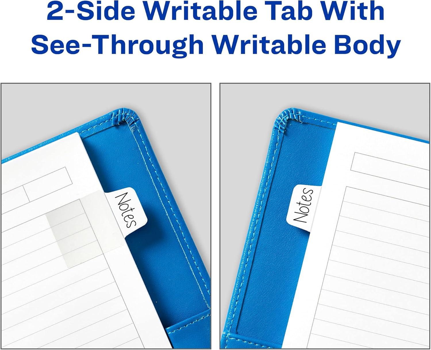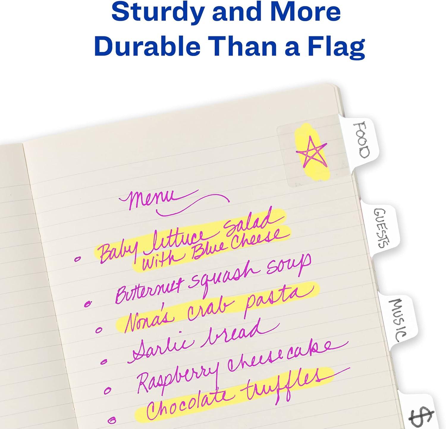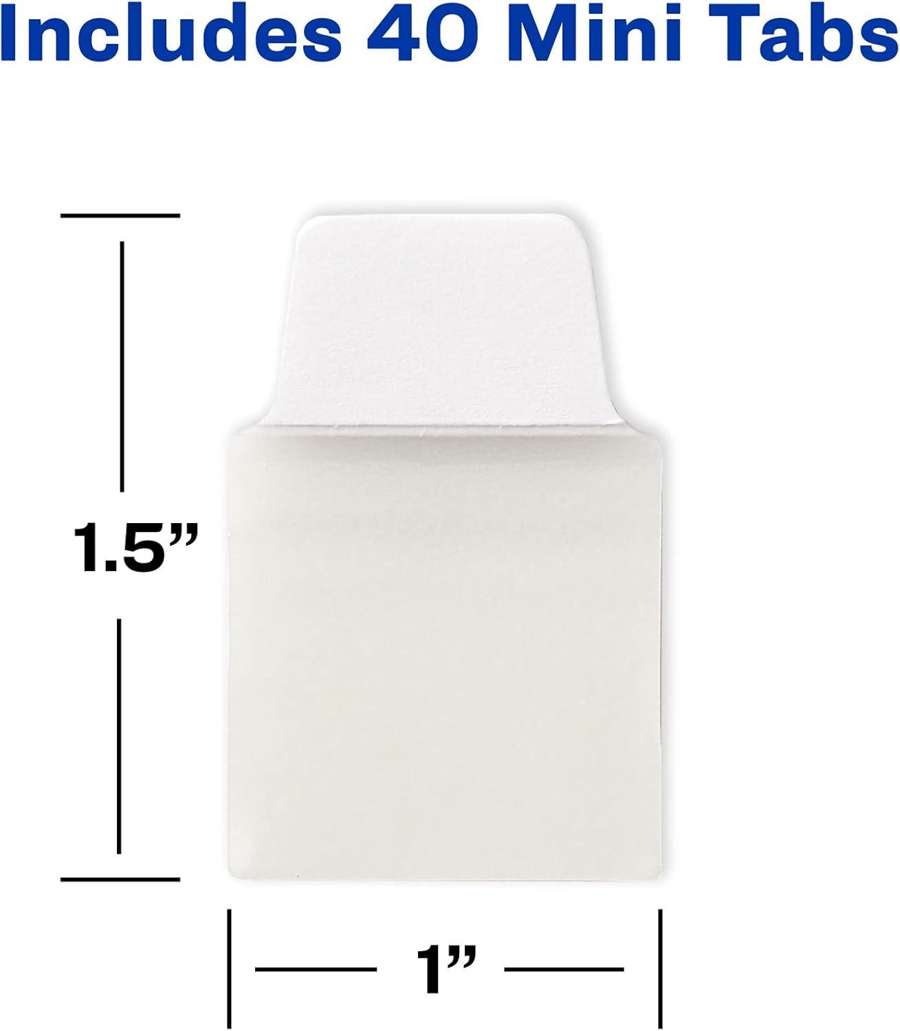 Avery Mini Ultra Tabs are durable tabs that make indexing, flagging and referencing quick and easy with a smaller size so you can fit more tabs in your books, notes and planners. The sturdy tabs are writable on both sides and the adhesive body is clear so you can still see the text underneath. Enjoy crisp, smudge free* writing on page tabs with most pens, pencils, markers and highlighters. The repositionable tabs stick securely and are strong enough to turn pages, yet remove easily without leaving residue or lifting ink. Perfect for home organization; use these sticky tabs as page flags in magazines, bible tabs for passages or recipe index tabs in cookbooks. Students, teachers and administrators will find it easy to highlight textbooks and notes without marking the pages. At the office, make quick and easy sticky notes in your weekly or monthly planner and mark items in a report or presentation for referencing, follow up or signatures.*Ink dry times may vary. Tab may lift some inks. Test before applying. The pack includes 40 white mini Ultra Tabs.
