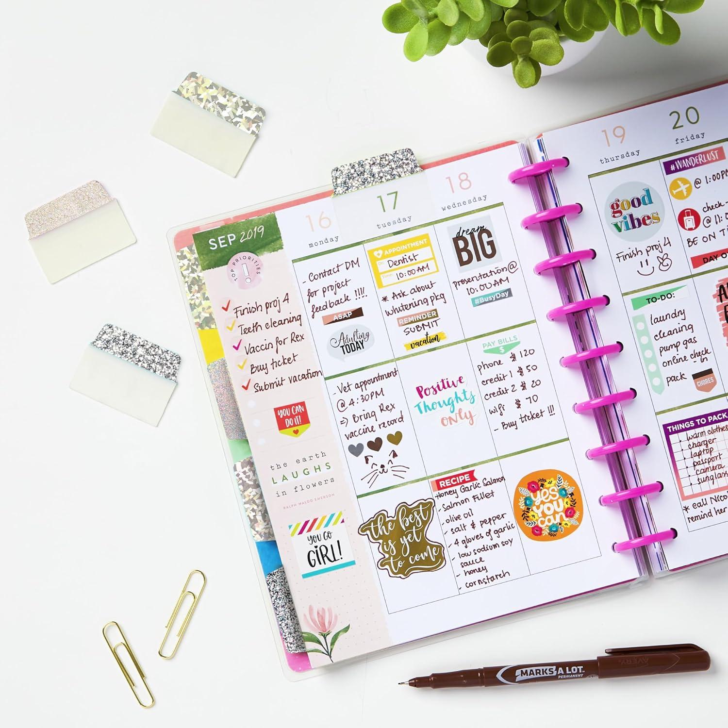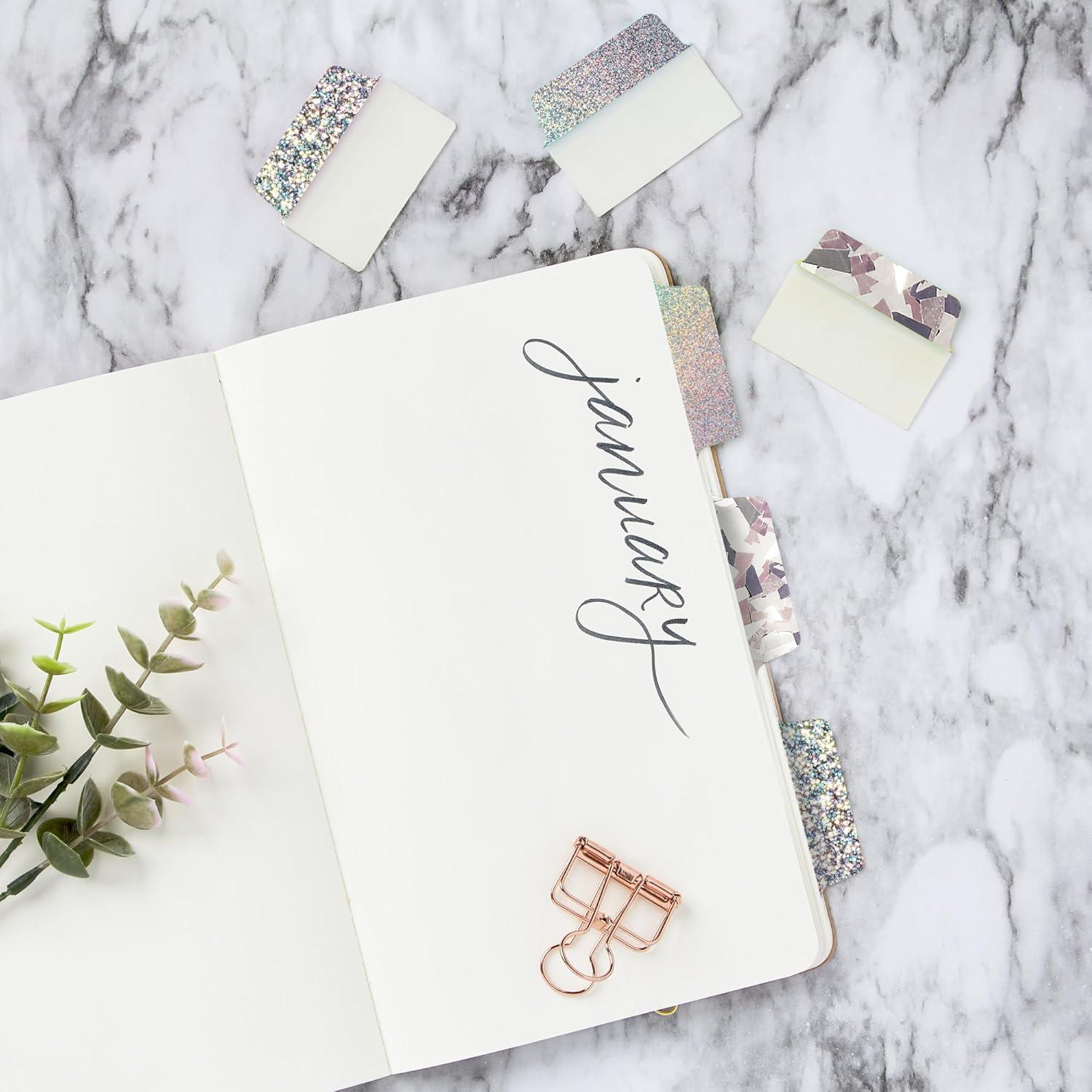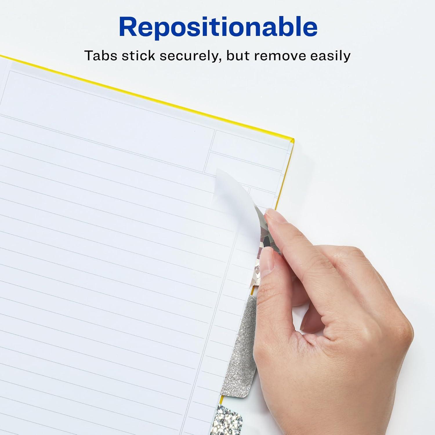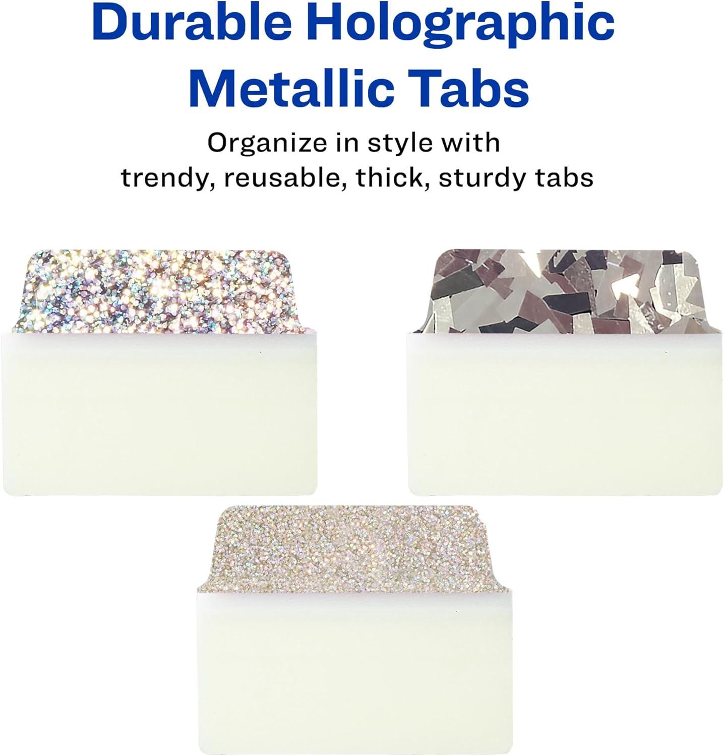 Upgrade your planners, notebooks, study guides and work supplies with brilliant holographic tabs from the Avery Ultra Tabs Luxe Collection. The tabs are created with an eye-catching reflective material and the lustrous surface catches light in striking angles that create a prismatic effect. Premium and chic, the Luxe Collection provides a range of Ultra Tabs that are certain to bring an elegant touch to any project. Each multi-use tab features a durable 1.75″ x .5″ tab and a 2″ x 1″ adhesive body. Both sides of the tab feature the prismatic design for easy visibility from any angle. The tab can be written on with Marks-A-Lot and other permanent markers and the body is compatible with most pens, pencils, permanent markers and highlighters. The tab body provides a transparent and smudge-free surface for writing but drying times can vary depending on the type of ink used. The repositionable adhesive on the opposite side of the tab body keeps tabs secure while also allowing for easy peeling to avoid residue and damage to the adhered surface. Along with the durable tab material, the repositionable adhesive allows these tabs to be easily reused over and over.