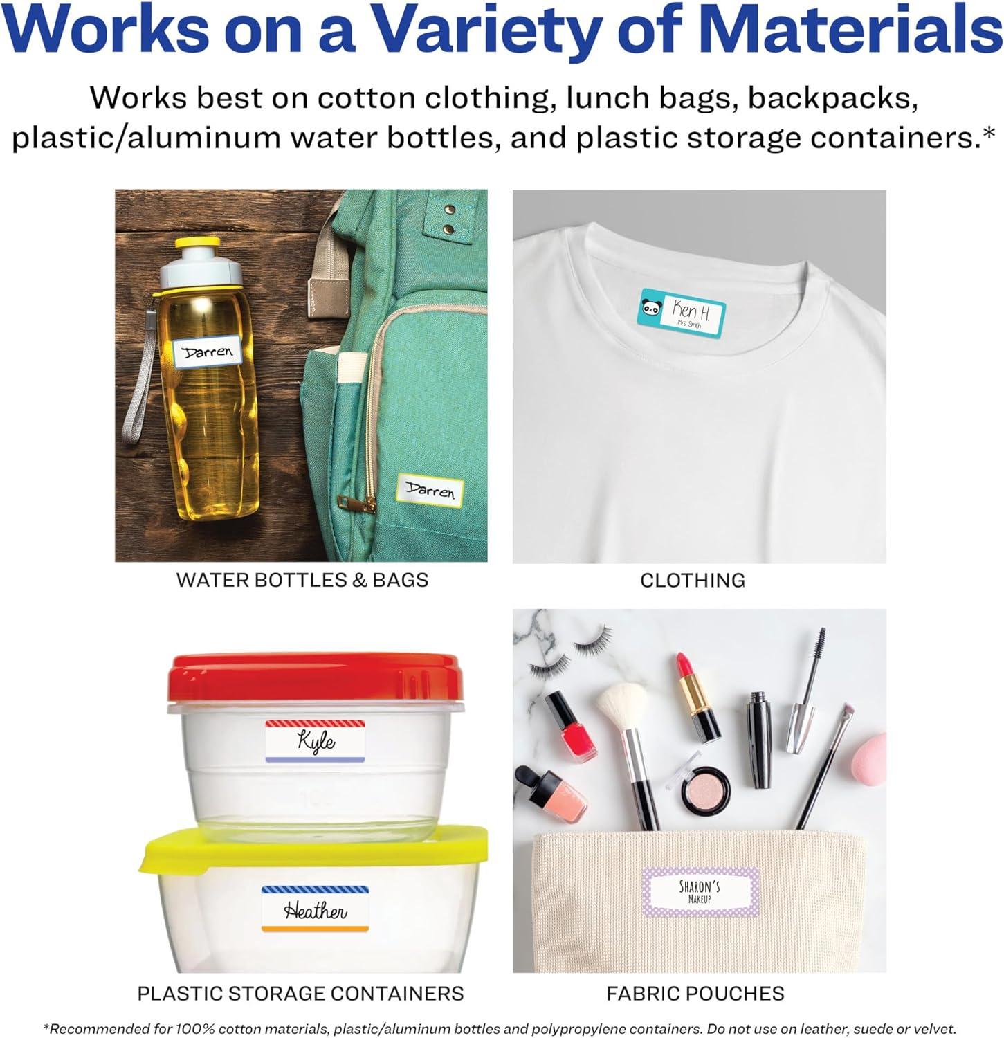 Label stickers are backed with a permanent adhesive that can be applied to a wide range of smooth surfaces, including fabric, water bottles, luggage, school supplies, and more with no iron required