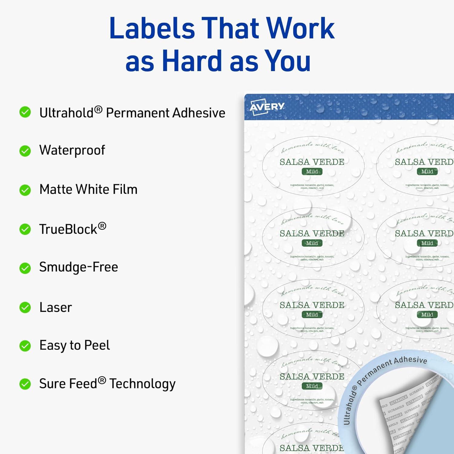Avery Outdoor Waterproof Oval Labels with Sure Feed Technology, 1.5″ x 2.5″, White Film, Compatible with Laser Printers, 450 Labels Total, Great for Product Branding, Packaging, and More(450 labels)