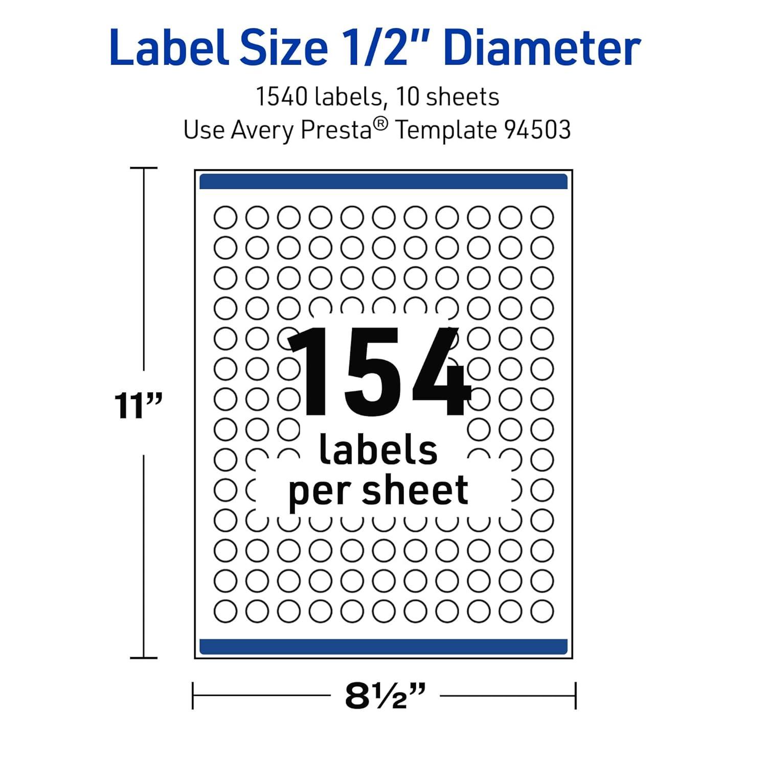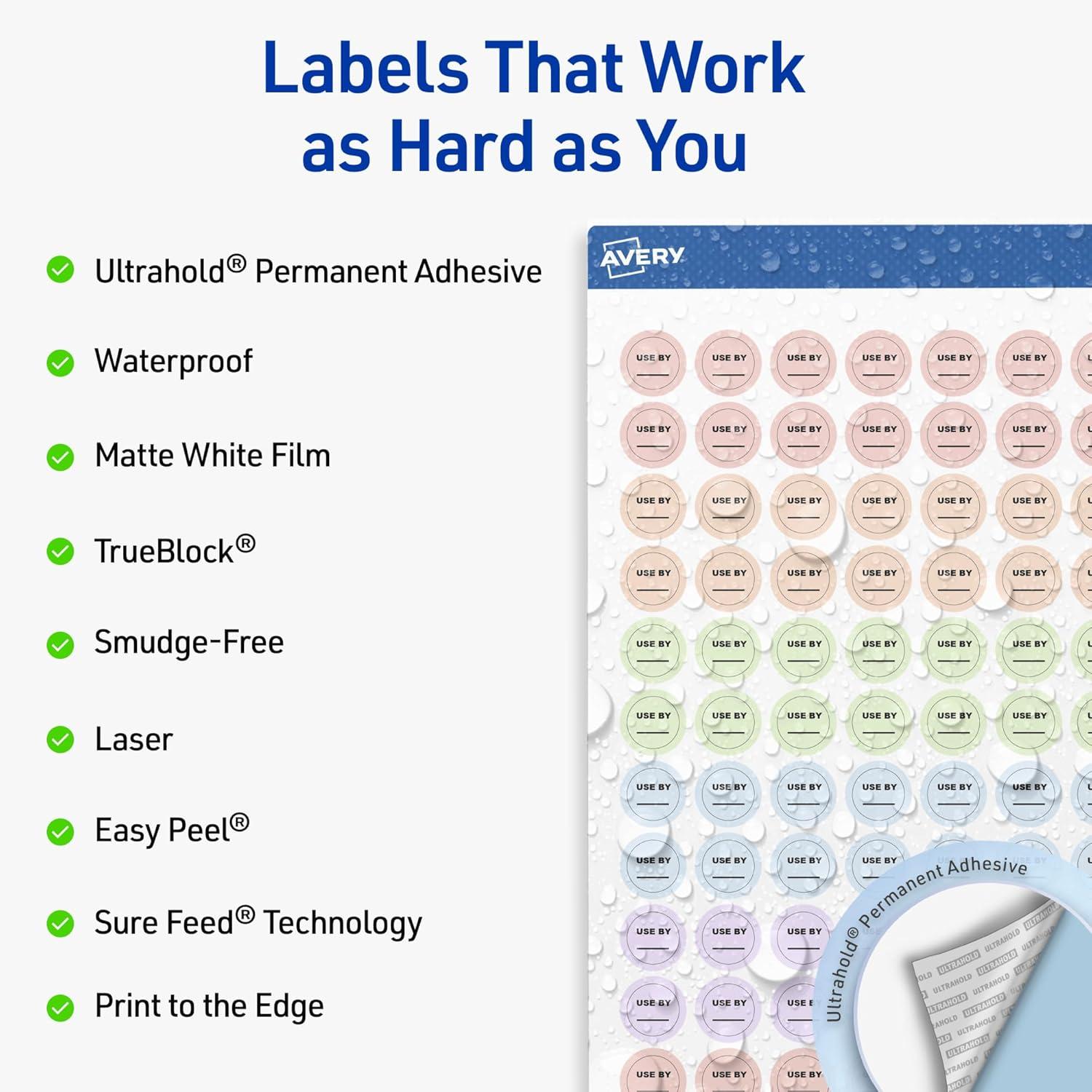 Avery Outdoor Waterproof Round Labels with Sure Feed Technology, 0.5" Diameter, White Film, Print-to-The-Edge, Compatible with Laser Printers, 3850 Labels Total(1 540 labels)