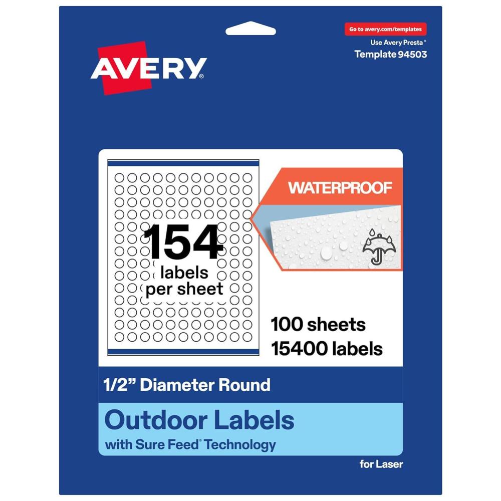 Avery Outdoor Waterproof Round Labels with Sure Feed Technology, 0.5″ Diameter, White Film, Print-to-The-Edge, Compatible with Laser Printers, 3850 Labels Total(15 400 labels)