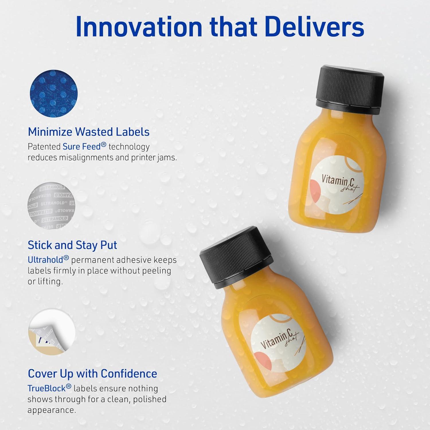 Print with confidence: Avery blank labels with patented Sure Feed technology provide a more reliable feed through your printer to help reduce misalignments and paper jams
