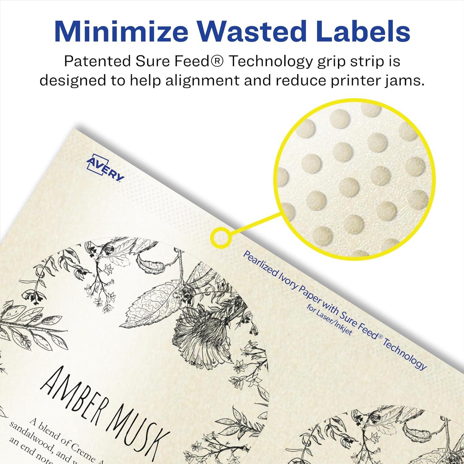 Avery labels with patented Sure Feed technology provide a more reliable feed through your printer, reducing misalignments and jams