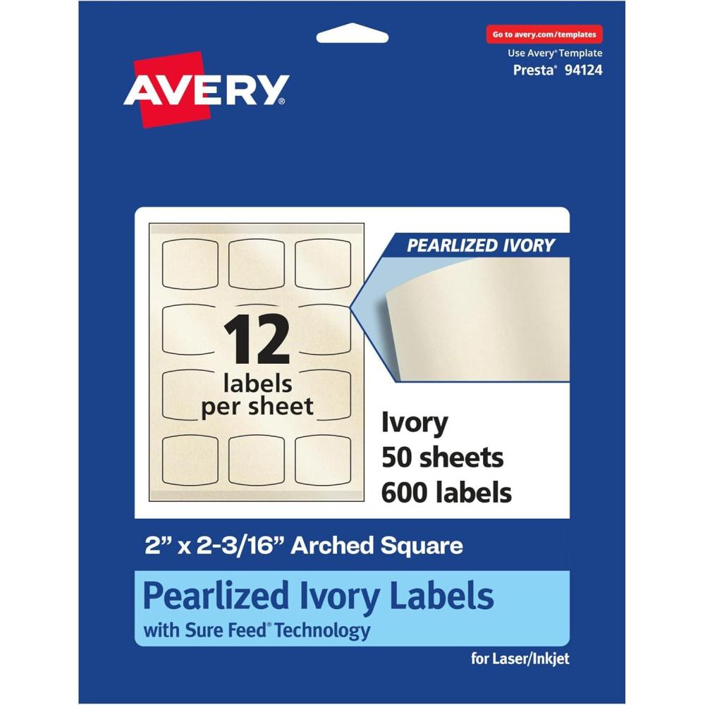 Add an elegant touch to wedding labels, cosmetic labels, lotion labels, soap labels, perfume labels, jar labels, candle labels, jewelry labels, mailing labels and more with Avery 2″ x 2-3/16″ Pearlized Ivory Arched Square Labels. The finish of the pearlized ivory material reflects light with a radiant glow that elevates any project. Avery arched square labels are carefully constructed with patented features to provide the best results. Sure Feed technology reduces jams or smudges by creating a more reliable feed through your printer. The print-to-the-edge layout lets you print beautiful full-bleed designs that fill each blank sticker to the edge. The strong permanent label adhesive makes sure that your labels stick and stay without peeling, curling or falling off. Dual-compatible with both laser printers and inkjet printers. Easily customize labels with your own designs, art, symbols and messaging by using the label templates and designs in Avery Design & Print. Whether you’re looking for elegant wedding labels or premium product labels that will grab people’s attention, Avery Pearlized Ivory Labels are the perfect choice for any project or event.