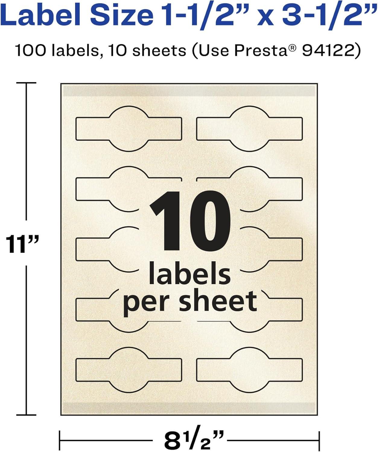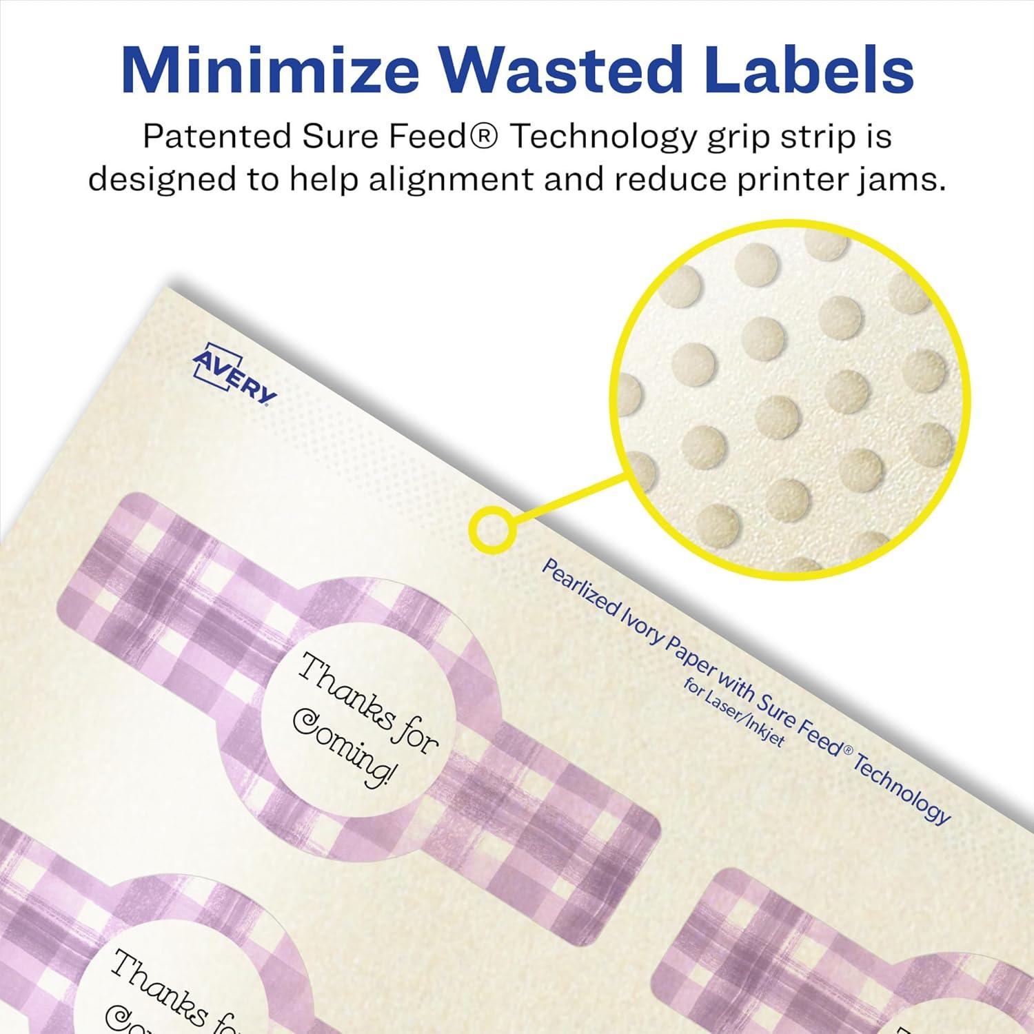 Add an elegant touch to wedding labels, cosmetic labels, lotion labels, body scrub labels, mailing seals, tamper-evident labels, bottle labels and more with Avery 1.5″ x 3.5″ Pearlized Ivory Wraparound Band Labels. The finish of the pearlized ivory material reflects light with a radiant glow that elevates any project. Avery wraparound band labels are carefully constructed with patented features to provide the best results. Sure Feed technology reduces jams or smudges by creating a more reliable feed through your printer. The print-to-the-edge layout lets you print beautiful full-bleed designs that fill each blank sticker to the edge. The strong permanent label adhesive makes sure that your labels stick and stay without peeling, curling or falling off. Dual-compatible with both laser printers and inkjet printers. Easily customize labels with your own designs, art, symbols and messaging by using the label templates and designs in Avery Design & Print. Whether you’re looking for elegant wedding labels or premium product labels that will grab people’s attention, Avery Pearlized Ivory Labels are the perfect choice for any project or event.