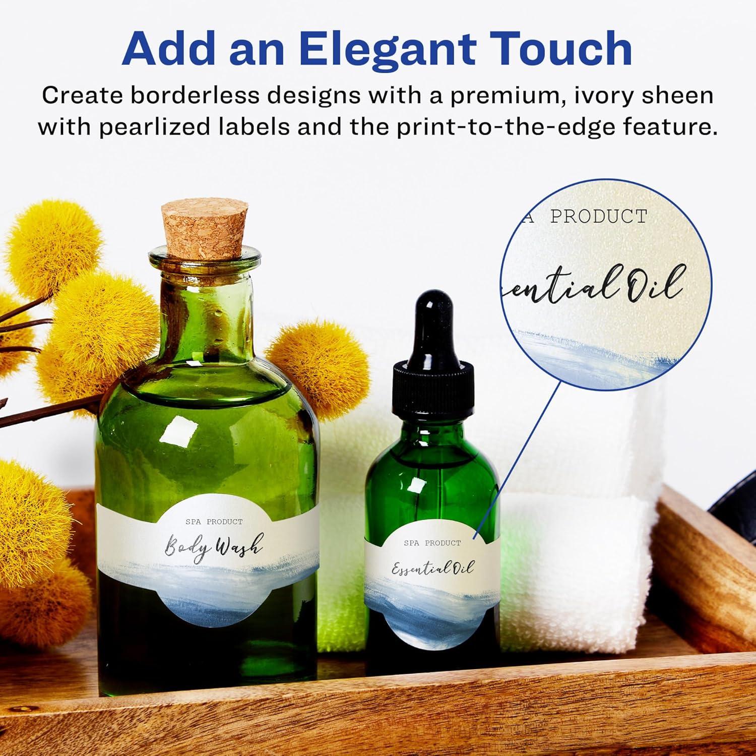 Add an elegant touch to wedding labels, cosmetic labels, lotion labels, body scrub labels, mailing seals, tamper-evident labels, bottle labels and more with Avery 1.5″ x 3.5″ Pearlized Ivory Wraparound Band Labels. The finish of the pearlized ivory material reflects light with a radiant glow that elevates any project. Avery wraparound band labels are carefully constructed with patented features to provide the best results. Sure Feed technology reduces jams or smudges by creating a more reliable feed through your printer. The print-to-the-edge layout lets you print beautiful full-bleed designs that fill each blank sticker to the edge. The strong permanent label adhesive makes sure that your labels stick and stay without peeling, curling or falling off. Dual-compatible with both laser printers and inkjet printers. Easily customize labels with your own designs, art, symbols and messaging by using the label templates and designs in Avery Design & Print. Whether you’re looking for elegant wedding labels or premium product labels that will grab people’s attention, Avery Pearlized Ivory Labels are the perfect choice for any project or event.