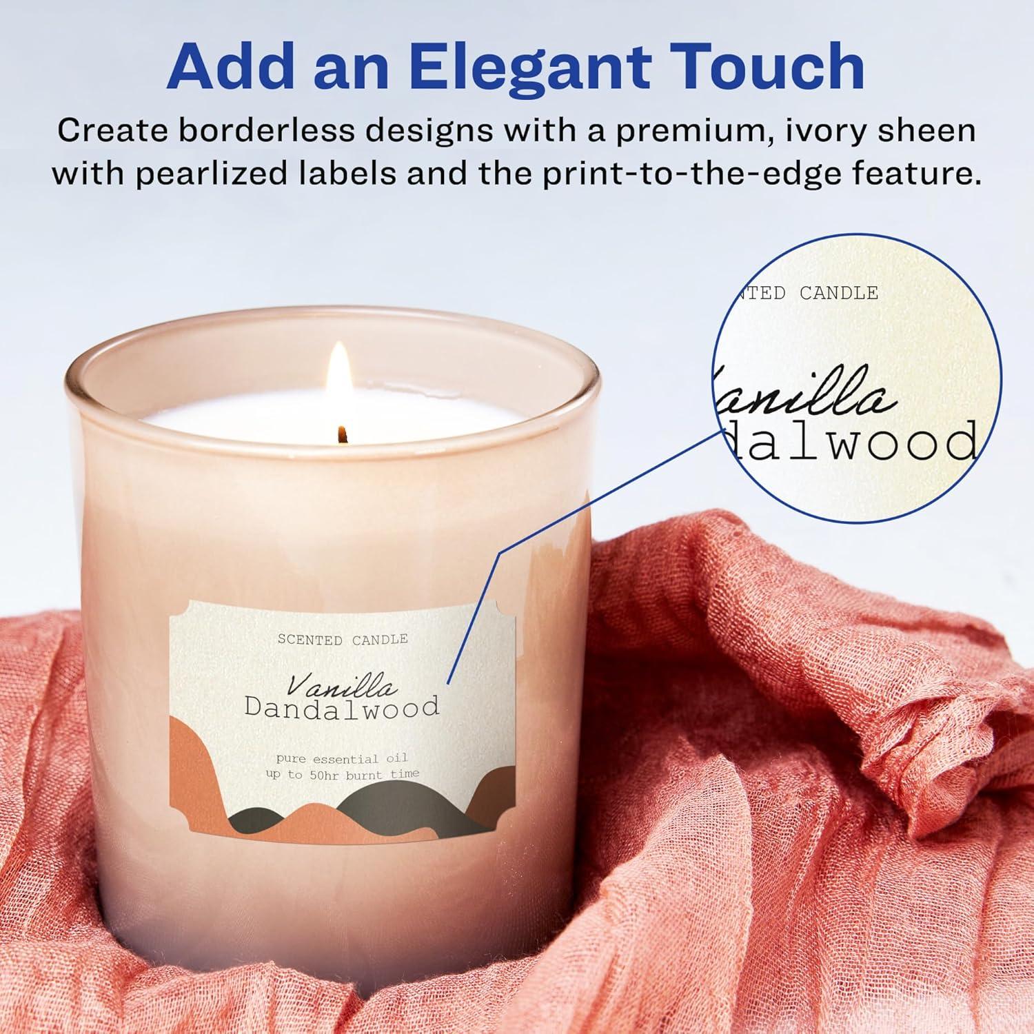 Add an elegant touch to wedding labels, mailing labels, product labels, labels for food containers, soap labels, candle jar labels, body scrub labels and more with Avery 2″ x 3″ Pearlized Ivory Rectangle Scalloped Labels. The finish of the pearlized ivory material reflects light with a radiant glow that elevates any project. Avery rectangle scalloped labels are carefully constructed with patented features to provide the best results. Sure Feed technology reduces jams or smudges by creating a more reliable feed through your printer. The print-to-the-edge layout lets you print beautiful full-bleed designs that fill each blank sticker to the edge. The strong permanent label adhesive makes sure that your labels stick and stay without peeling, curling or falling off. Dual-compatible with both laser printers and inkjet printers. Easily customize labels with your own designs, art, symbols and messaging by using the label templates and designs in Avery Design & Print. Whether you’re looking for elegant wedding labels or premium product labels that will grab people’s attention, Avery Pearlized Ivory Labels are the perfect choice for any project or event.
