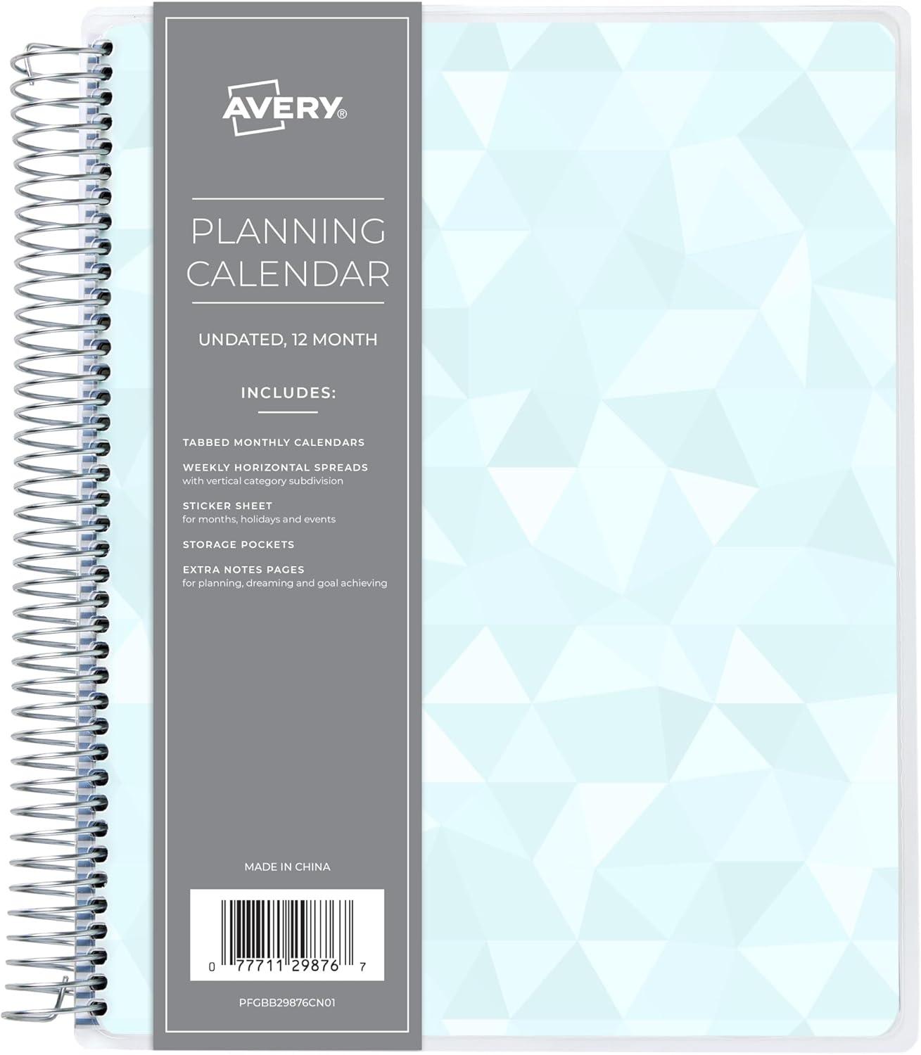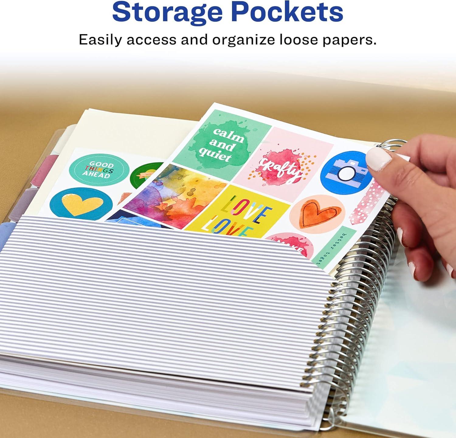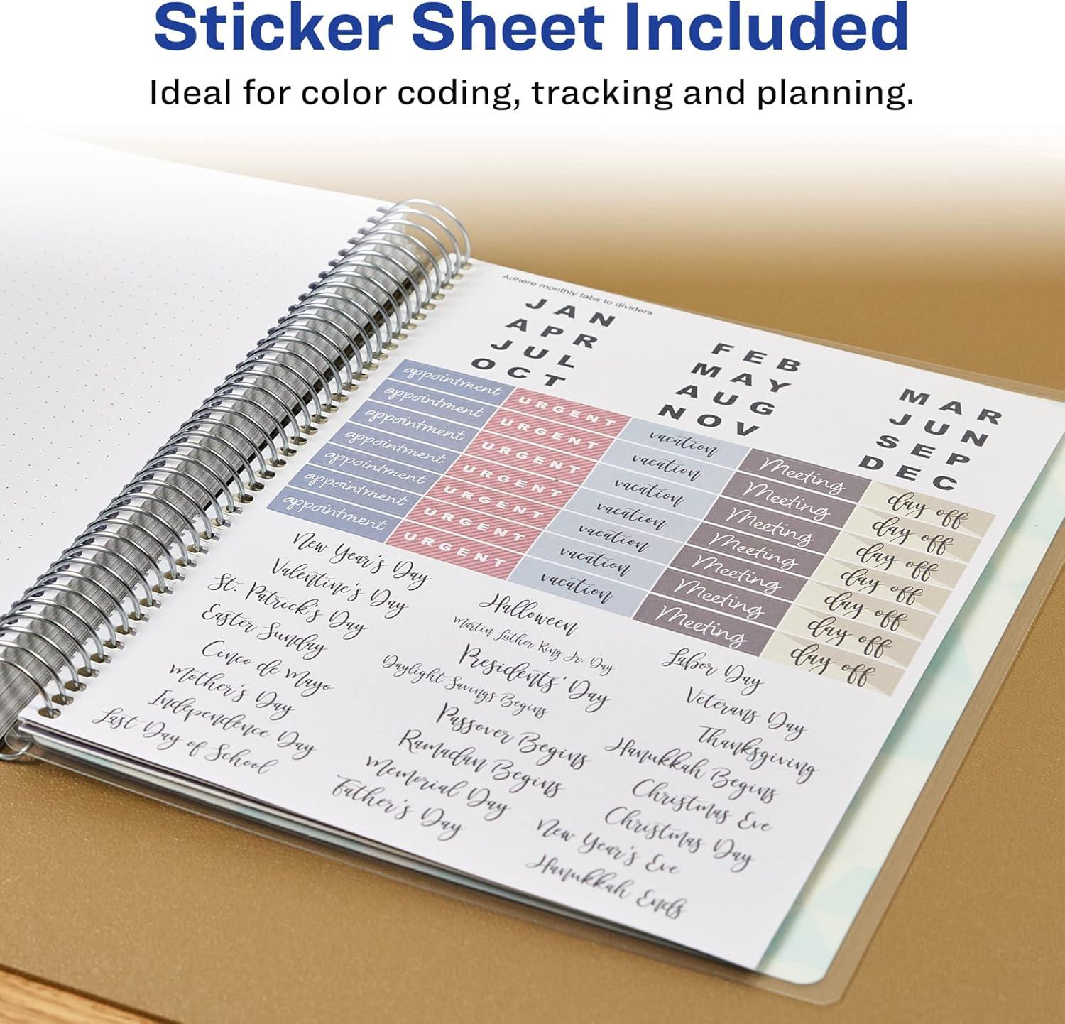 Stay organized throughout the year with Avery 29876 Planners in the Sage Harmony design. Title your undated 12 monthly tabbed dividers, using the accompanying monthly tab title stickers. This planner features a weekly two-page horizontal spread that lets you view your week at a glance. The minimalist chic design adds a simple splash of color and positivity to each day. Designed to last, the covers are made with water-resistant and tear-proof PVC that doubles as wet or dry-erase dashboards. Each page uses smooth, ultra-white 70lb / 120g uncoated sheets that complement most pens and are designed to resist smudging, bleeding and feathering. The spiral-bound planners lay flat allowing you to create your monthly or weekly works of art with ease. Also included is a sheet of planner stickers that work perfectly within the preprinted layouts, two extra pockets for loose sheets and extra note pages for drawings, diagrams and future planning.