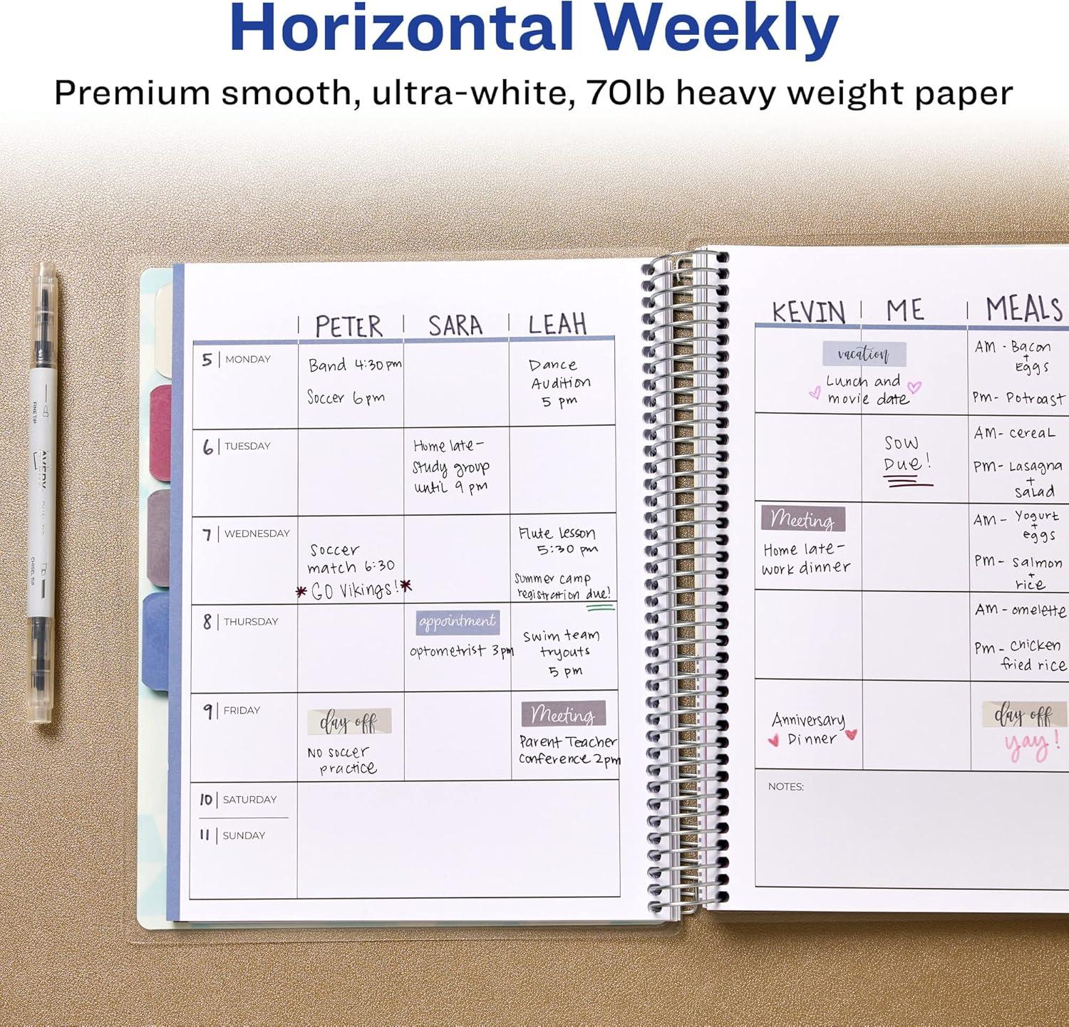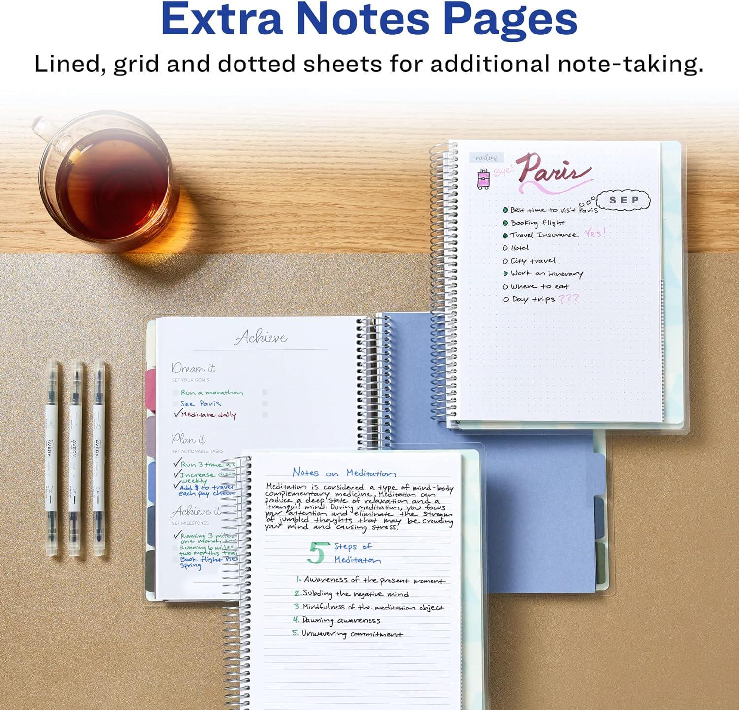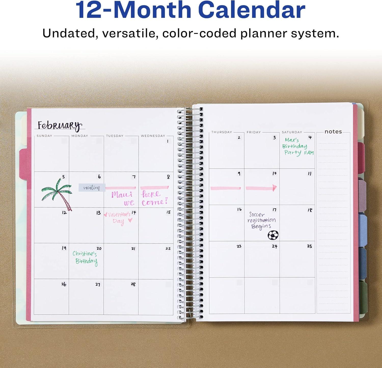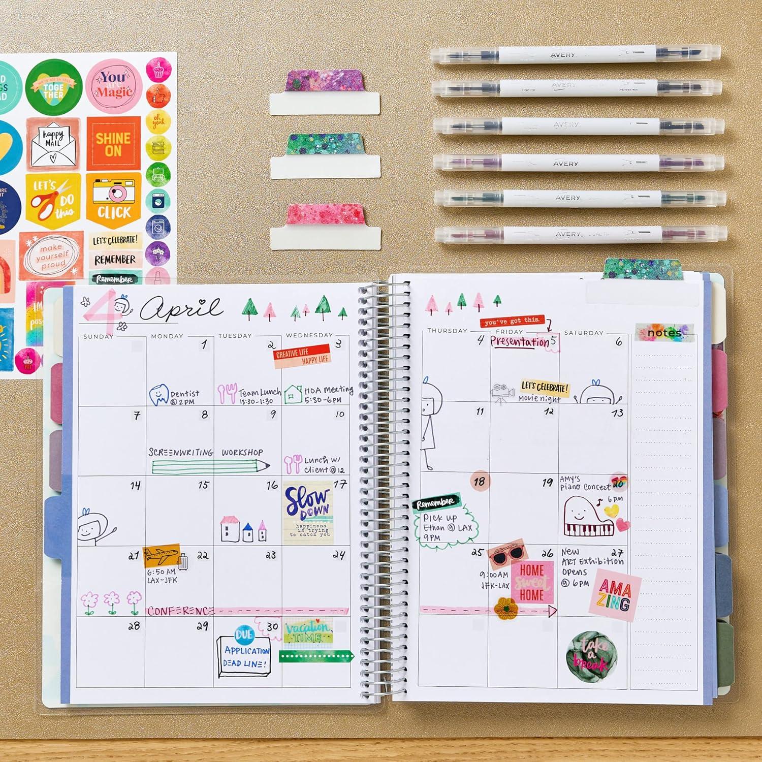 Stay organized throughout the year with Avery 29876 Planners in the Sage Harmony design. Title your undated 12 monthly tabbed dividers, using the accompanying monthly tab title stickers. This planner features a weekly two-page horizontal spread that lets you view your week at a glance. The minimalist chic design adds a simple splash of color and positivity to each day. Designed to last, the covers are made with water-resistant and tear-proof PVC that doubles as wet or dry-erase dashboards. Each page uses smooth, ultra-white 70lb / 120g uncoated sheets that complement most pens and are designed to resist smudging, bleeding and feathering. The spiral-bound planners lay flat allowing you to create your monthly or weekly works of art with ease. Also included is a sheet of planner stickers that work perfectly within the preprinted layouts, two extra pockets for loose sheets and extra note pages for drawings, diagrams and future planning.