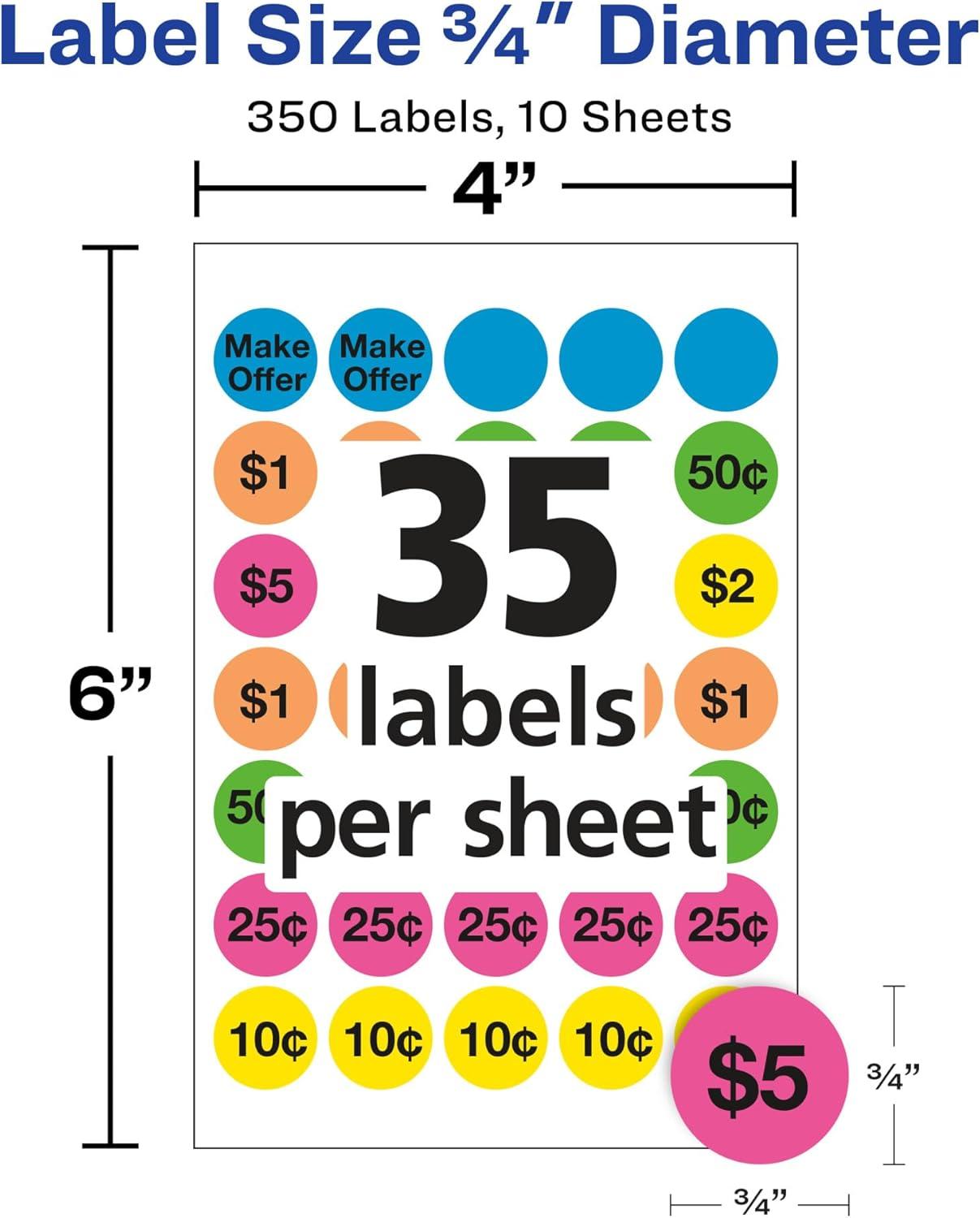 Make sure your garage sale, craft fair, swap meet or bake sale is well-organized and efficient with this pack of 350 Avery 5480 pre-printed removable pricing labels. These 3/4″ small round labels are pre-printed to let you swiftly and efficiently price individual items for sale, from 10 cents to 20 dollars, while the bright colors are sure to catch the eyes of any potential shopper. There are also “make offer” labels included for those hard-to-price items, as well as blank labels so you can create your own custom price labels with a pen, pencil, marker or other writing instrument. Labels are not compatible with printers. No need to worry about hard-to-remove price tag labels or any of that annoying, sticky residue that gets left behind, because these round removable labels are designed to peel off cleanly and easily after the sale or when you want to adjust a price. Save time and effort with these easy-to-use color-coding labels and get your items sold in no time!