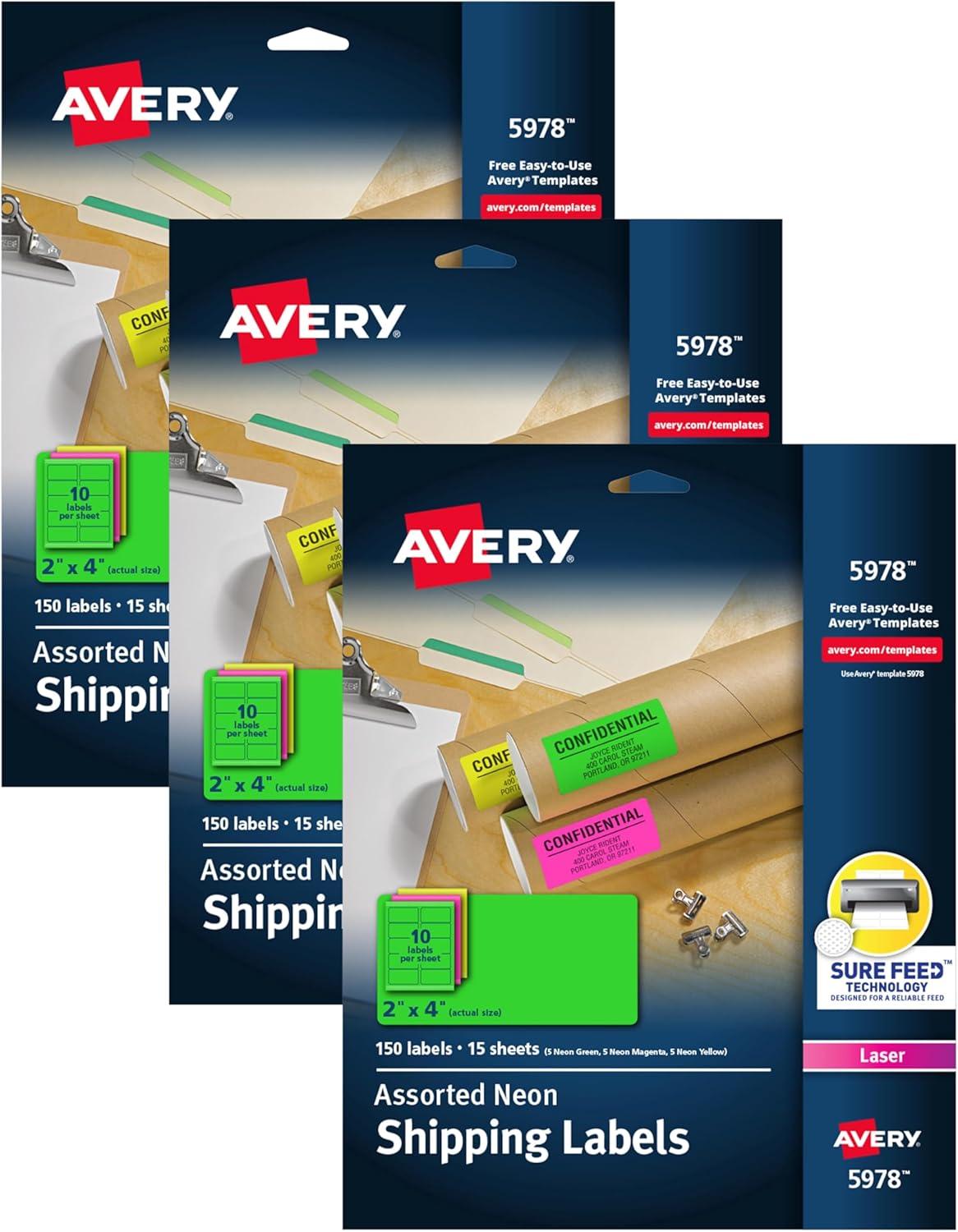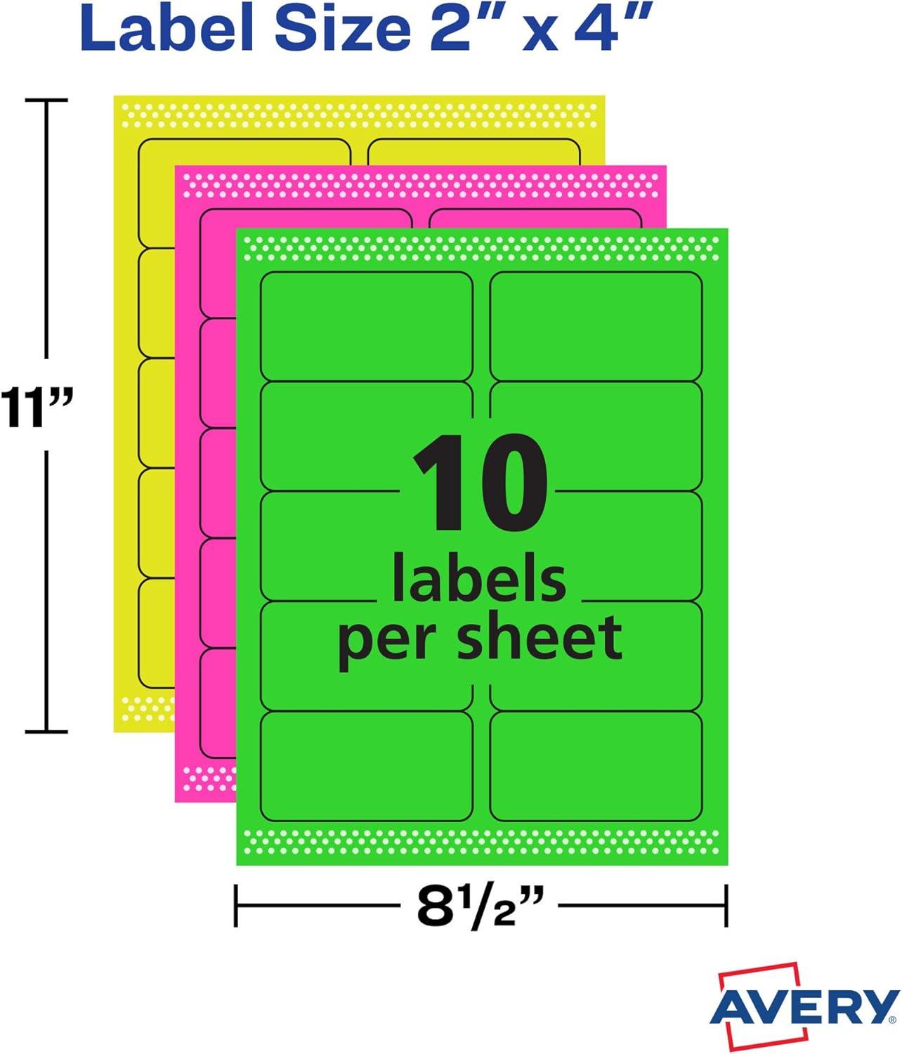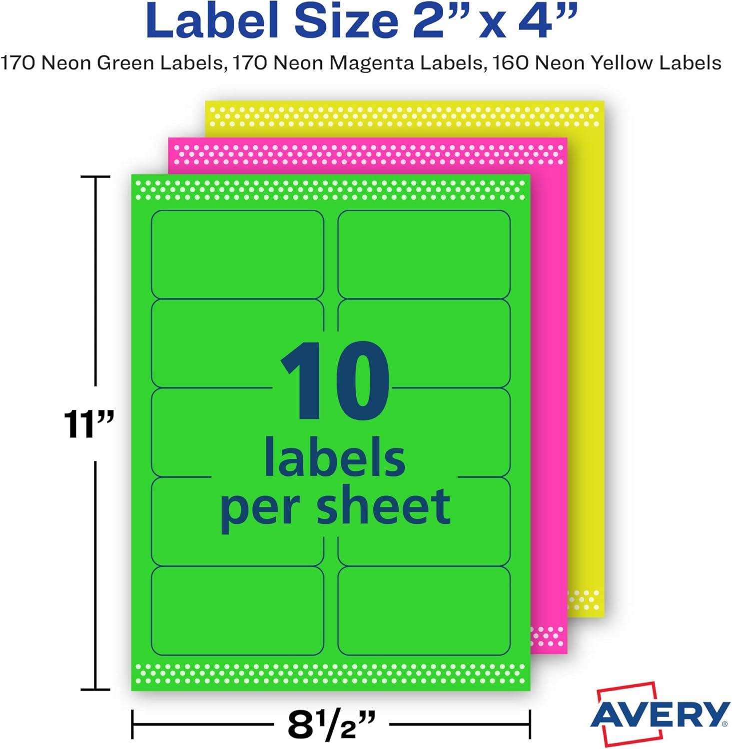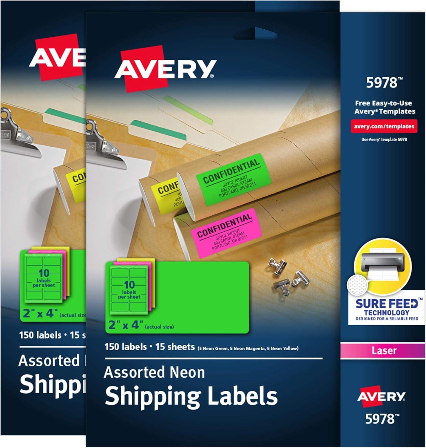 Avery Printable Address Labels with Sure Feed, 2" x 4", Assorted Neon (Magenta, Green, Yellow), 150 Blank Mailing Labels (5978)(Assorted)