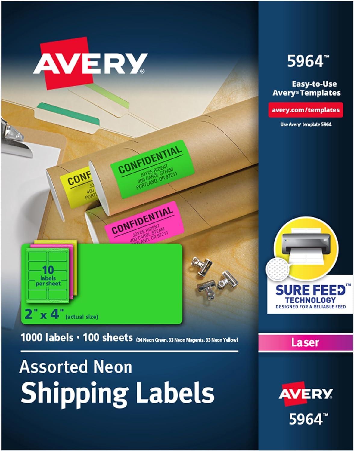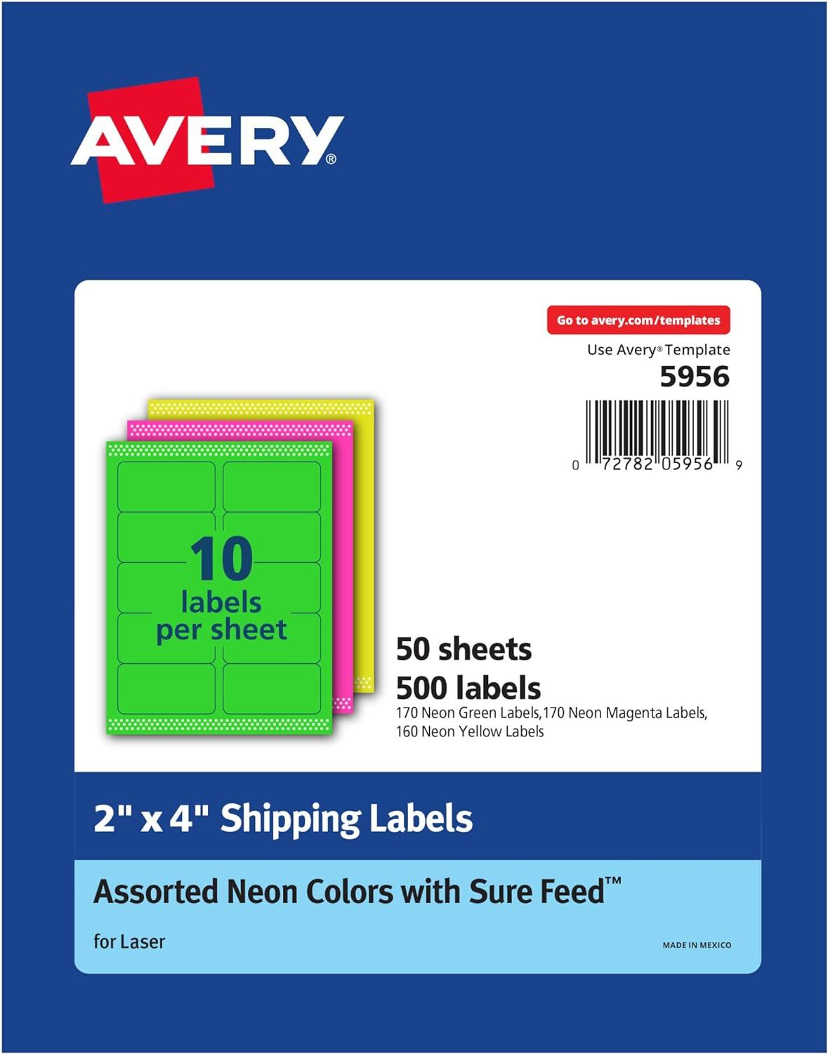 Creating attention-grabbing labels often needs more than a catchy phrase. They may also need bright colors to draw them in. Create eye-catching labels and let your message stand out with Avery Neon Shipping Labels for Laser Printers. Easily design and personalize your unique laser address labels with the thousands of free designs, templates, and mail merge tools on the Avery site. For long lasting hold, these strong stick rectangle labels are designed with a permanent adhesive. Expect high-quality, smudge free printing results with 2×4 labels from Avery that are optimized for laser printers. Ensure a clean printing job and prevent any misalignments or jams using Avery Sure Feed technology. The pack of assorted fluorescent neon 2×4 shipping labels include green, pink, and yellow. The color labels are great for ID labels, organization labels, mailing labels, shipping labels, folder labels, or party favor labels. The pack includes 150 total neon stickers, and each of the label sheets are sized at 8 1⁄2? x 11?.