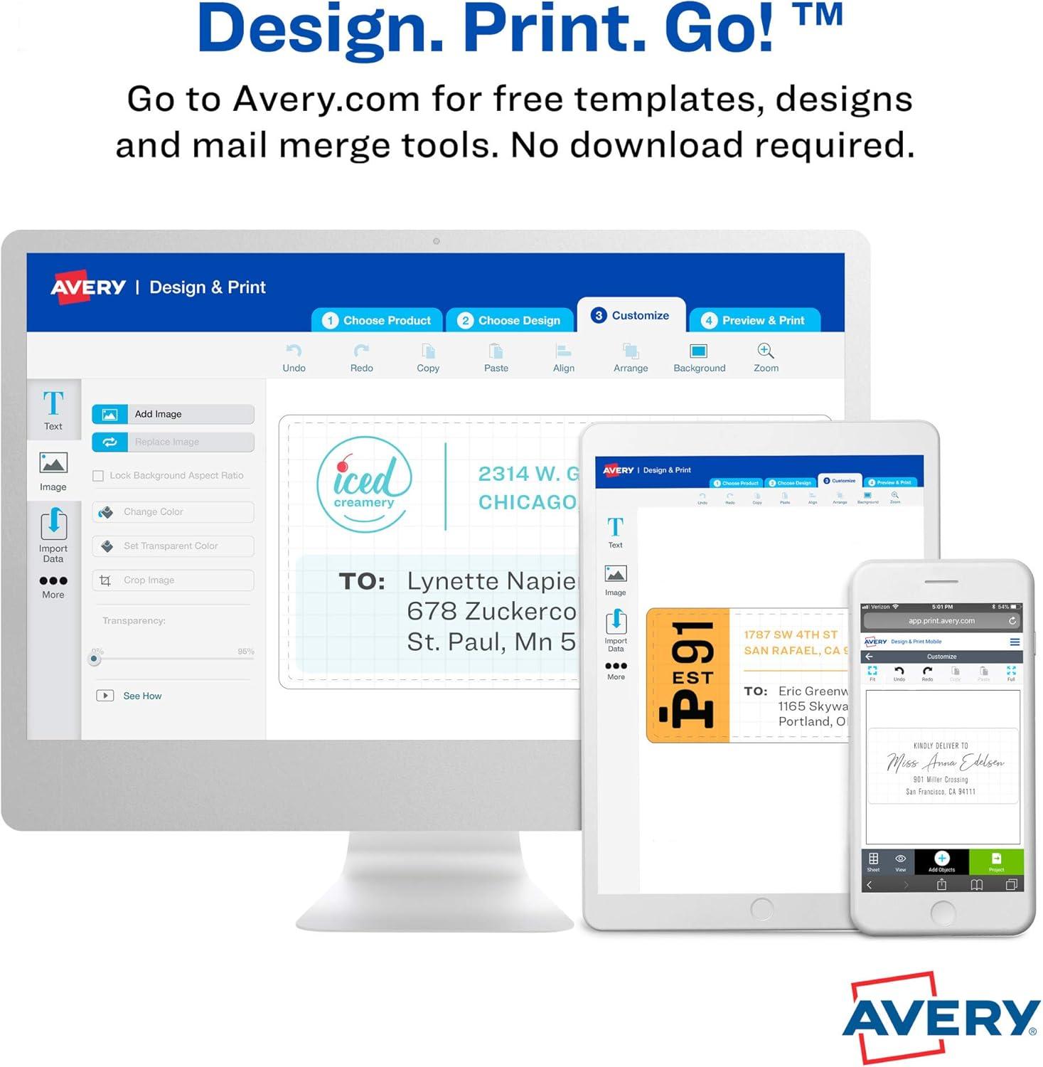 Customize mailing address labels by hand, with your own text and graphics, or use the free templates, designs and easy mail merge feature on the Avery website