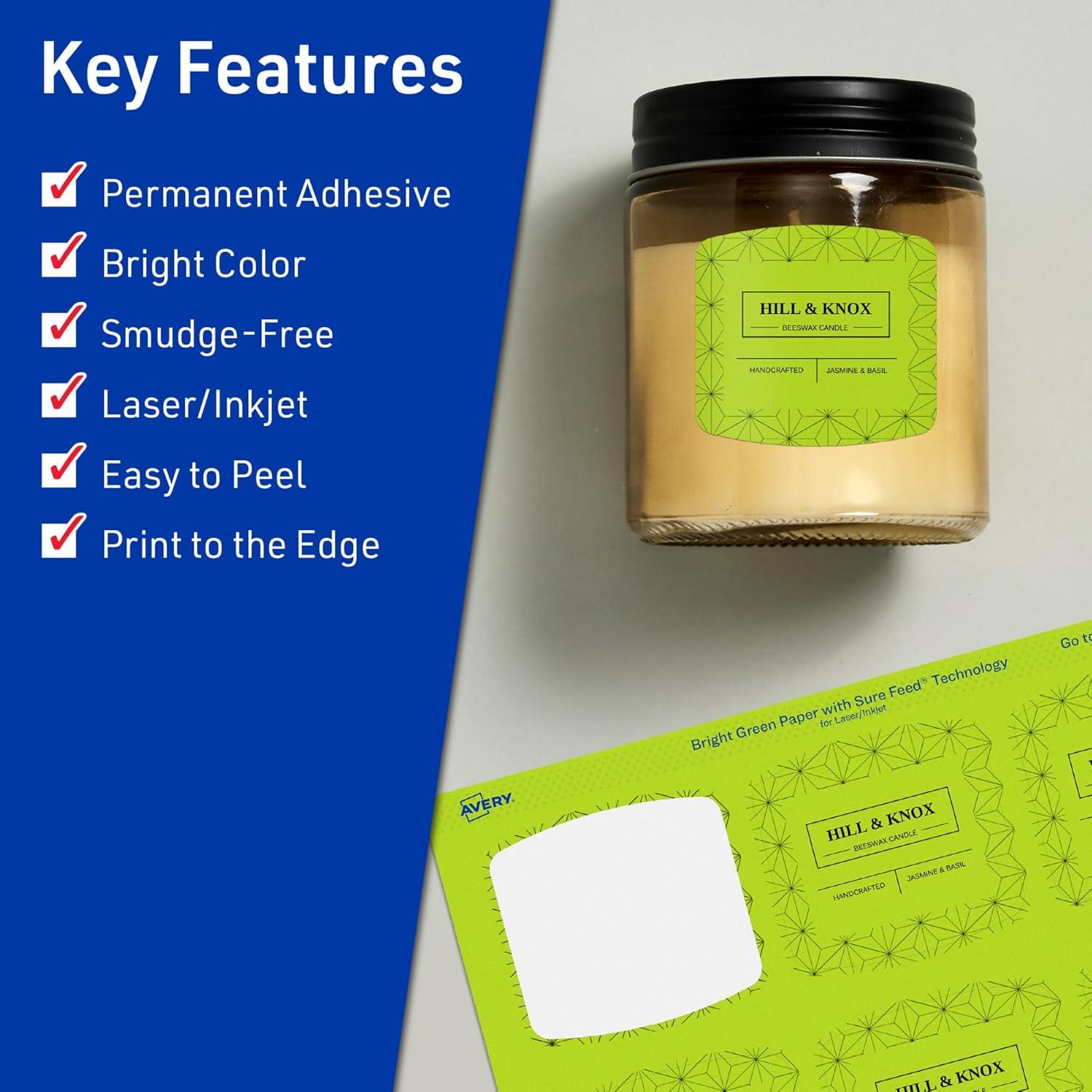 Avery Printable Arched Square Labels with Sure Feed Technology, 2″ x 2-3/16″, Bright Green, Print-to-The-Edge, Laser/Inkjet, 240 Total(240 labels)