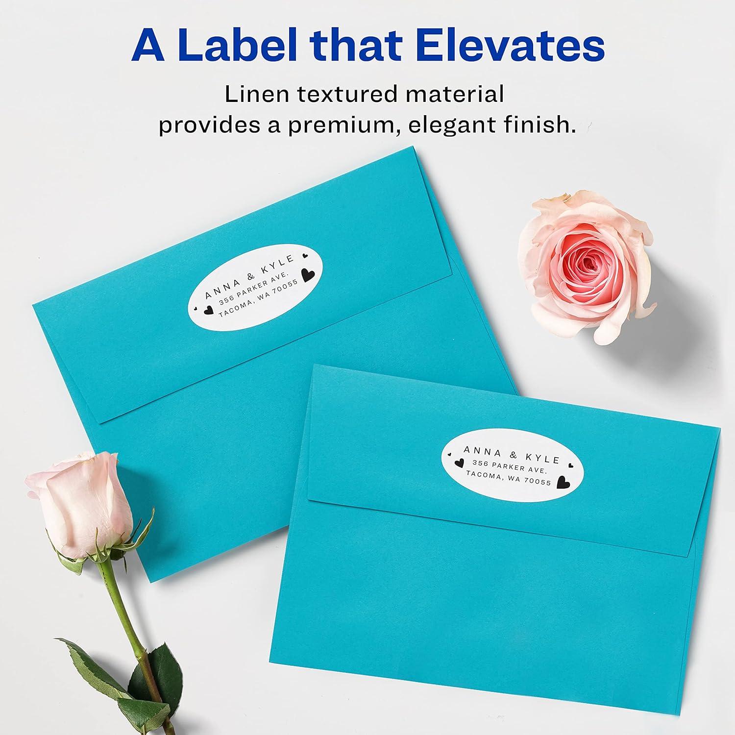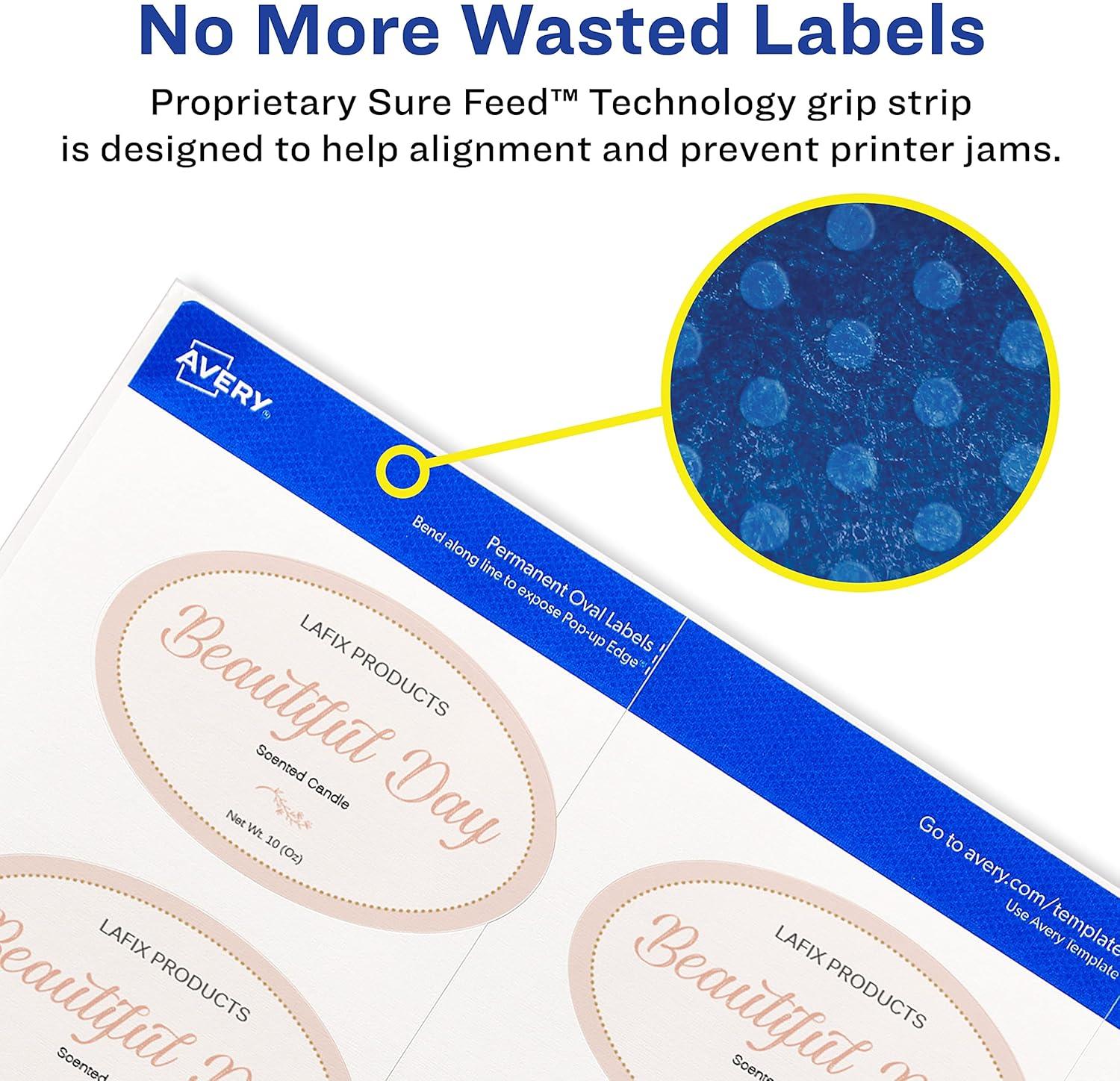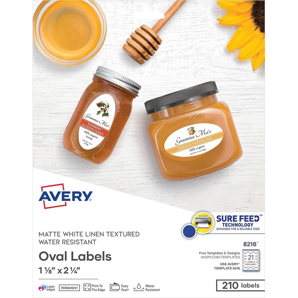 Add a special look and feel to gifts, water bottles, packaging and other items with premium oval labels. These textured white 1-1/8″ x 2-1/4″ blank printable labels are water resistant and guaranteed to endure moisture and scuffing. The flexible, polyester material also ensures that the label stickers hold firm on curved surfaces while also being strong enough to withstand tearing. Our Print-to-the-Edge feature allows you to create eye-catching full bleed labels with sharp text and crisp images printed with no border or margin. Avoid printing misalignments and jams and ensure a clean printing job with our Sure Feed technology. Labels are quick and easy to apply with our patented Easy Peel label sheets with Pop-up Edge. Simply fold the sheet back to display the label edges for convenient and fast peeling. Once applied, the permanent adhesive ensures the label stickers hold fast to smooth surfaces like paper, cardboard, plastic, glass and painted metals. Effortlessly create customized sticker labels with your own text, art and photos, or use the free templates from Avery Design & Print to design food storage labels, gift label stickers, canning labels and more. Try it out today on the Avery site. This item comes with 21 labels per sheet and includes 10 sheets for a total of 210 blank white labels.