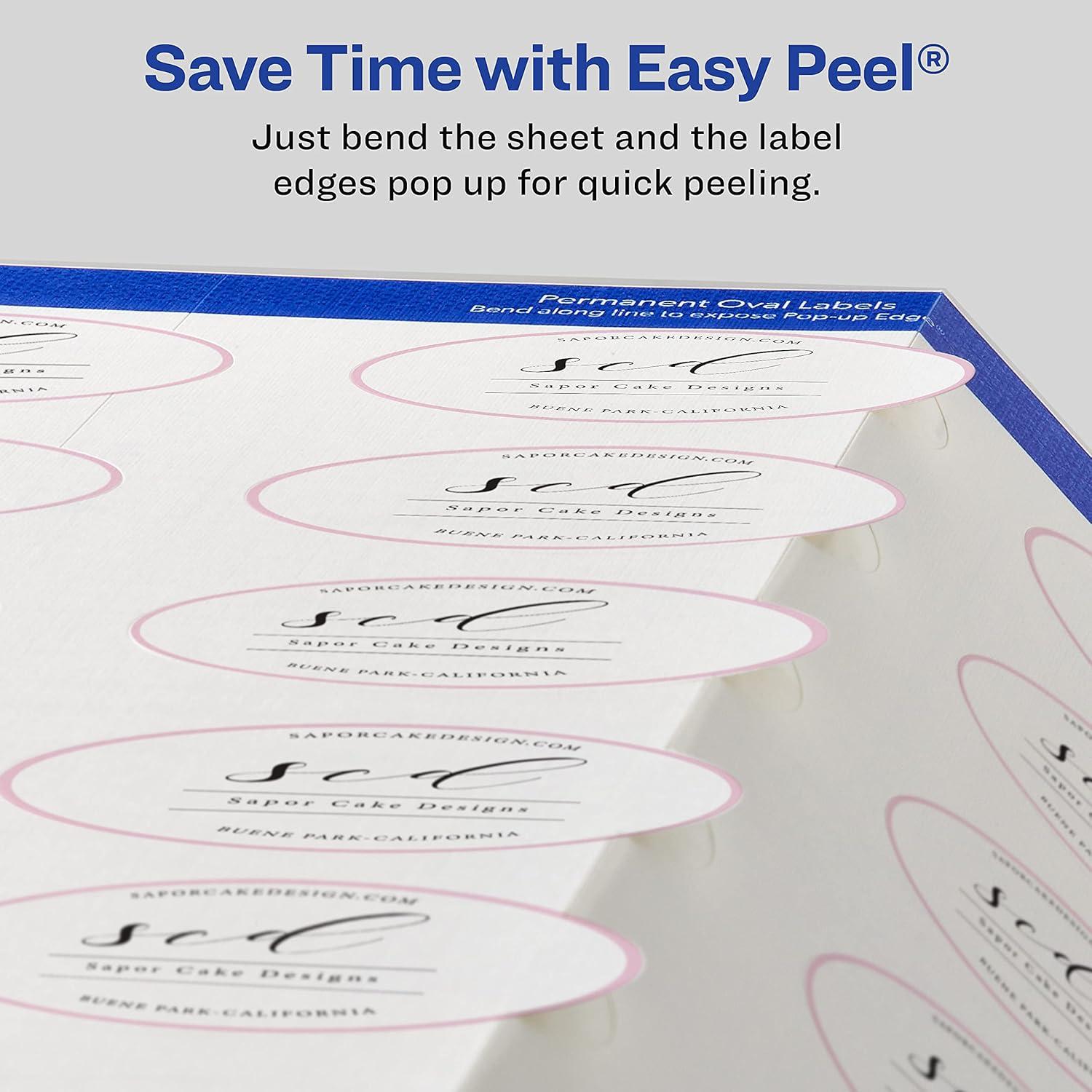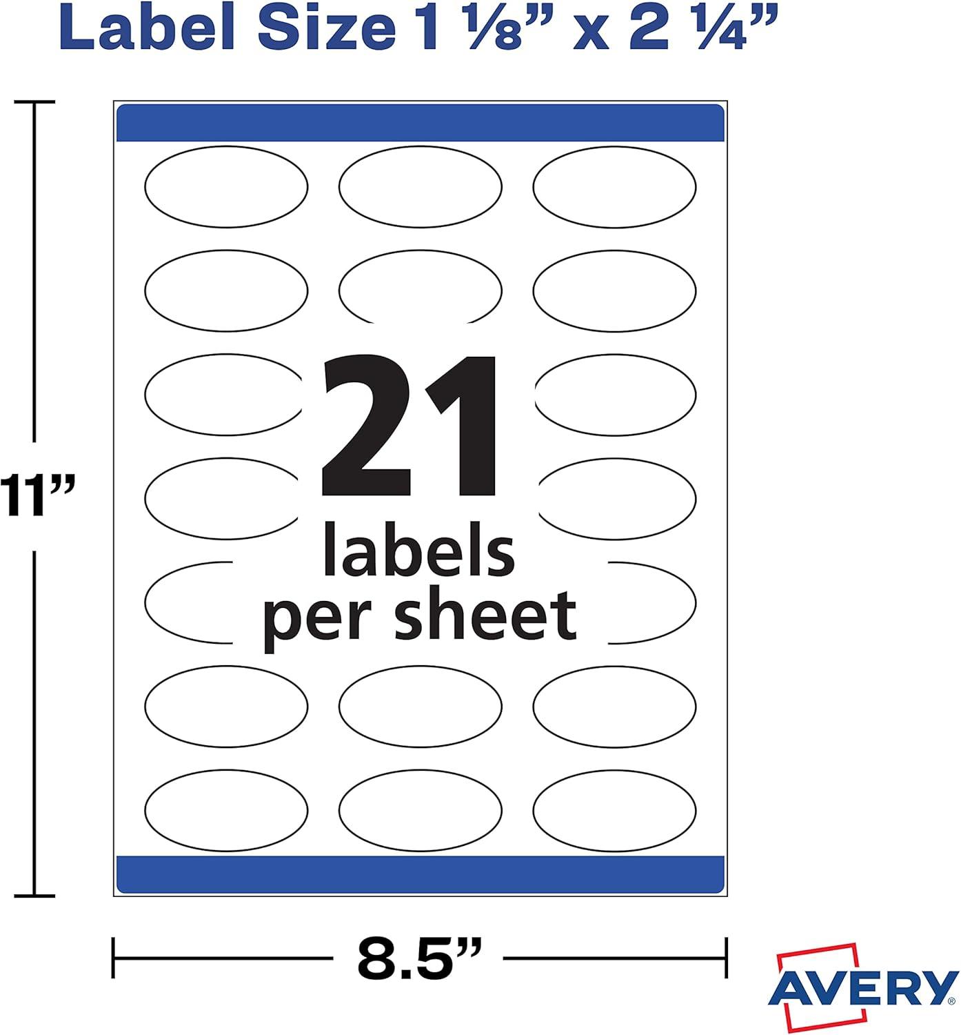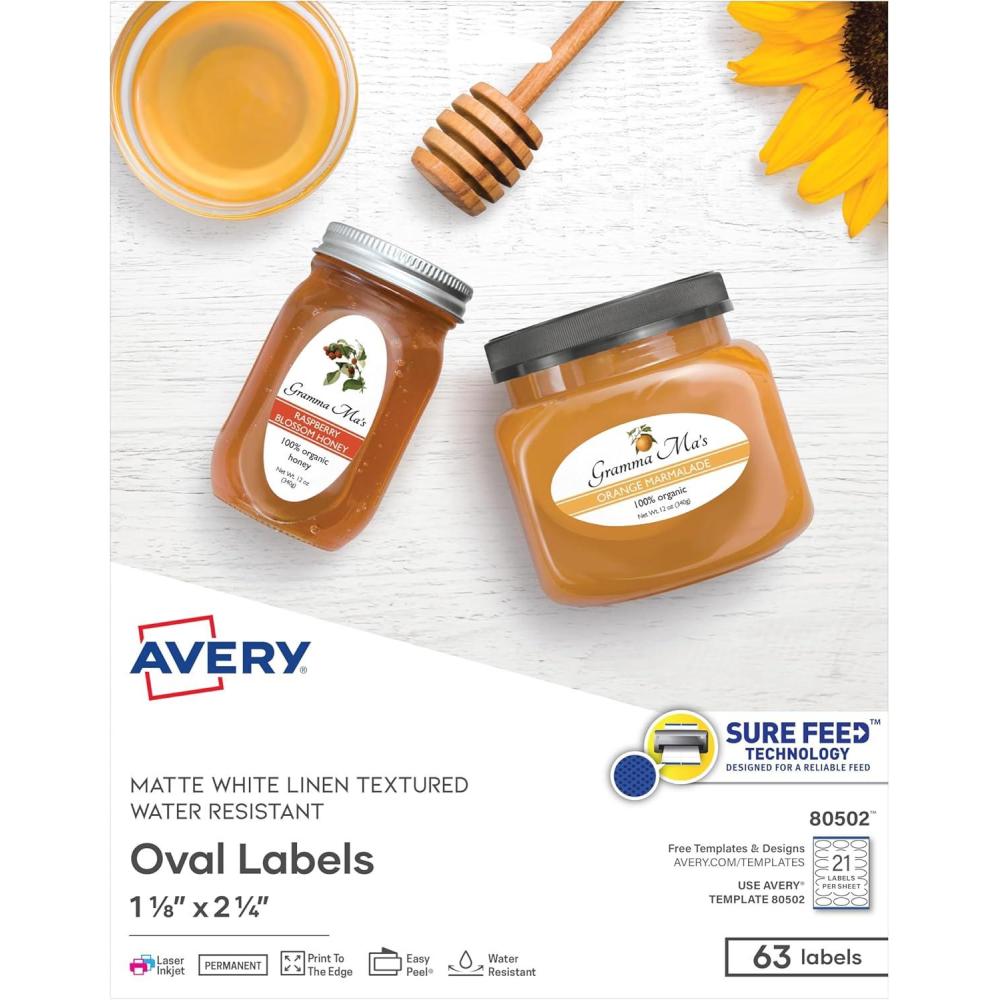Add a special look and feel to gifts, water bottles, packaging and other items with premium oval labels. These textured white 1-1/8″ x 2-1/4″ blank printable labels are water resistant and guaranteed to endure moisture and scuffing. The flexible, polyester material also ensures that the label stickers hold firm on curved surfaces while also being strong enough to withstand tearing. Our Print-to-the-Edge feature allows you to create eye-catching full bleed labels with sharp text and crisp images printed with no border or margin. Avoid printing misalignments and jams and ensure a clean printing job with our Sure Feed technology. Labels are quick and easy to apply with our patented Easy Peel label sheets with Pop-up Edge. Simply fold the sheet back to display the label edges for convenient and fast peeling. Once applied, the permanent adhesive ensures the label stickers hold fast to smooth surfaces like paper, cardboard, plastic, glass and painted metals. Effortlessly create customized sticker labels with your own text, art and photos, or use the free templates from Avery Design & Print to design food storage labels, gift label stickers, canning labels and more. Try it out today on the Avery site. This item comes with 21 labels per sheet and includes 3 sheets for a total of 63 blank white labels.