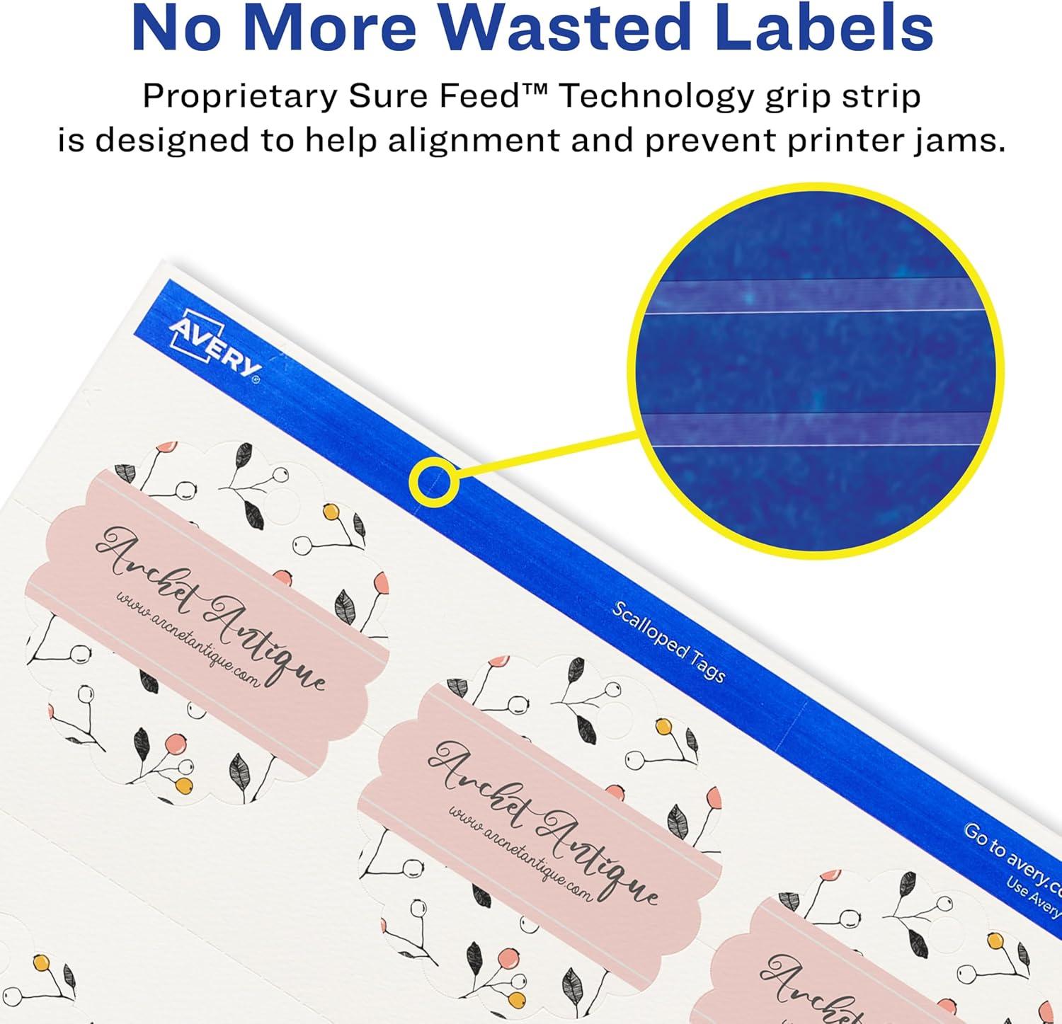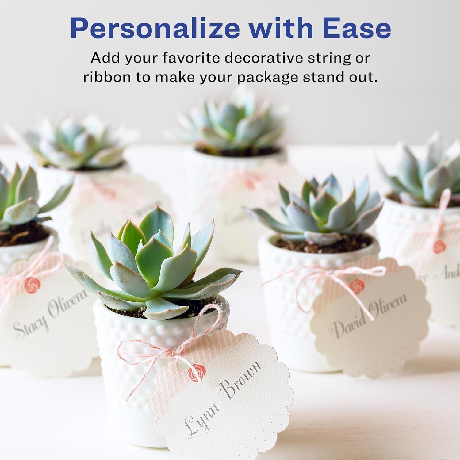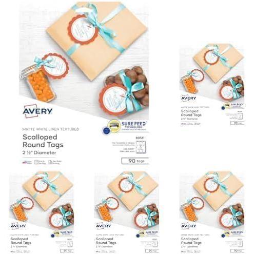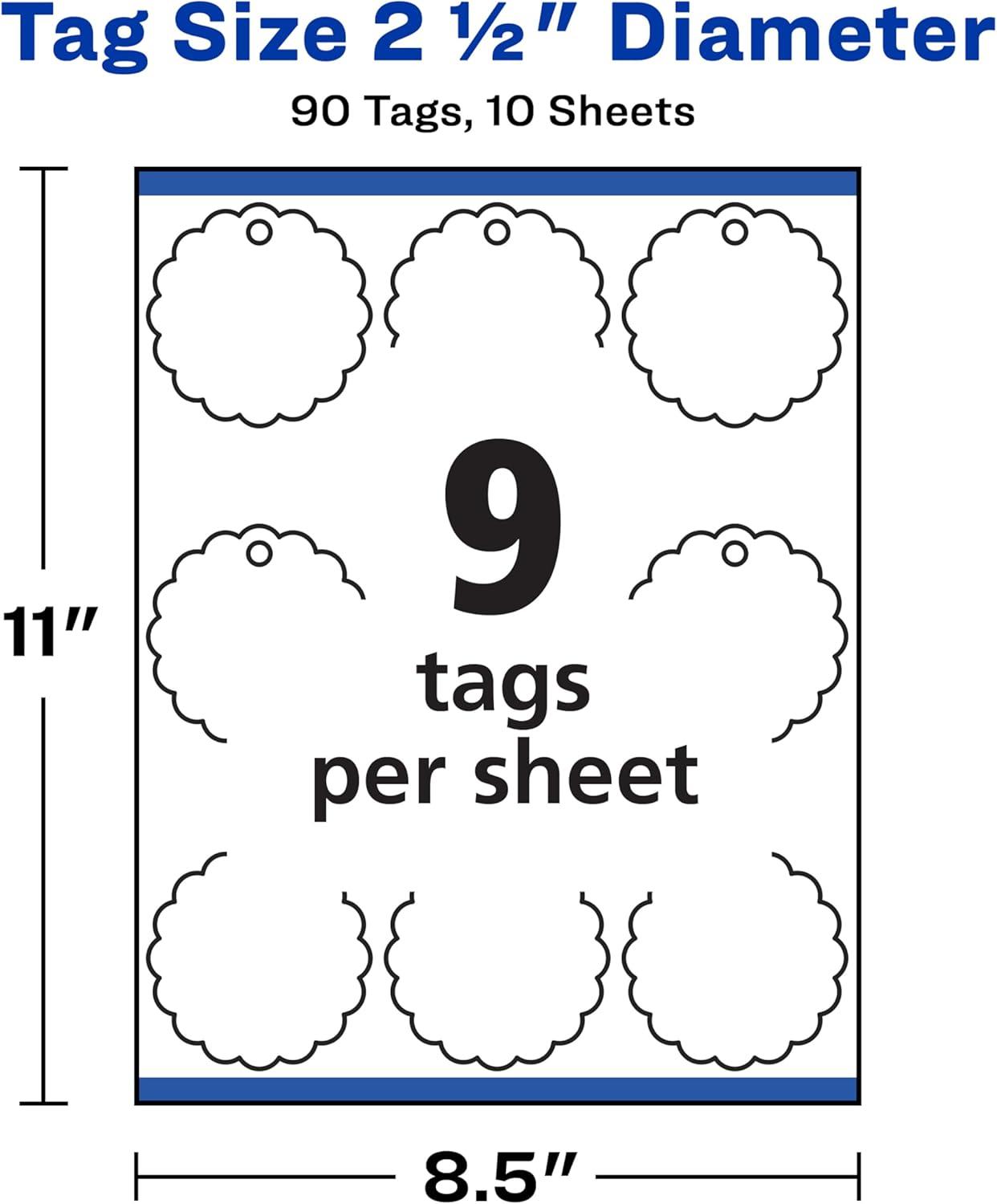 Easily create accent tags with these printable round tags with scalloped edge, and personalize them with names, dates, captions and photos. Perfect for unique party favors, gifts, handmade products, treat bags and more. Made from premium, heavyweight white cardstock, the blank tags feature a linen texture for a high-quality feel, as well as a pre-punched hole for easy attachment. Handwrite directly on either side of the blank hanging tags for one-of-a-kind creations or get crisp, smudge-free printing of your double-sided creation from your laser or inkjet printer. Our Print-to-the-Edge feature allows you to create eye-catching, full bleed custom tags with sharp text and crisp images printed with no border or margin. Avoid printing misalignments and jams and ensure a clean printing job with our Sure Feed technology. Effortlessly create personalized gift tags with your own text, art and photos, or use the free templates, designs and fonts from Avery Design & Print. Try it out today on the Avery website. Great for thank you tags, price tags, name tags for gifts, product tags and more. Item comes with 10 sheets (9 tags per sheet) and a total of 90 printable tags (strings not included).