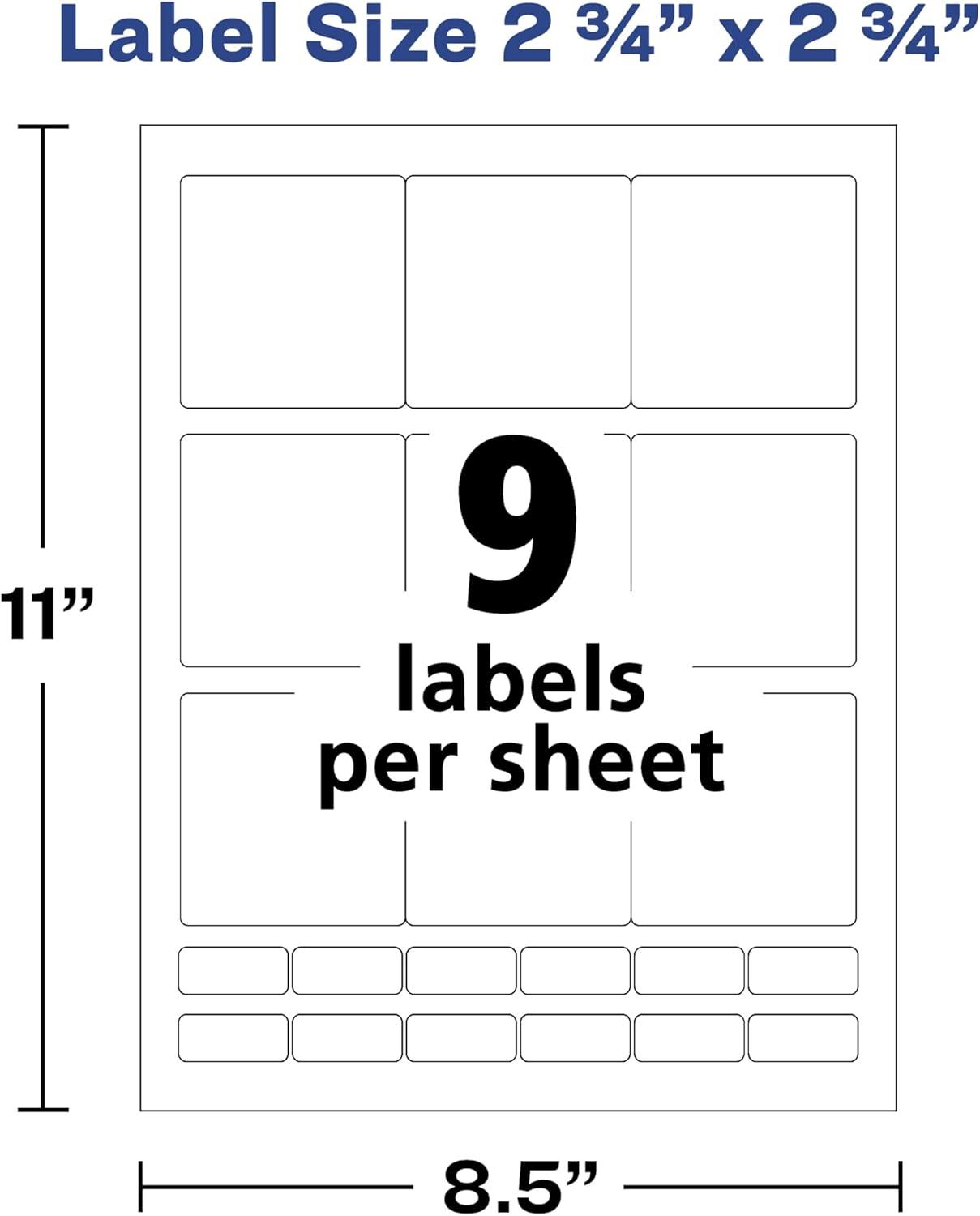 Make sure your product or project packs just the right punch with these customizable square labels. The classic white surface of these 2.75” x 2.75” blank printable labels allow your text and colorful graphics to stand out, resulting in a polished and professional finish. There are also 12 mini labels included at the bottom of each sheet. These bonus 1/2″ x 1-3/8″ rectangle labels can be written on for quick identification or to add extra notes. Easily print at home or at work with your personal laser or inkjet printer. These versatile labels are the perfect size for food labels, disk labels, ingredient labels, price tags and more. Once applied, the permanent adhesive ensures the label stickers hold fast to smooth surfaces like paper, cardboard, plastic, glass and painted metals. Effortlessly create customized sticker labels with your own text, art and photos, or use the free templates from Avery Design & Print to design recipe labels, QR code labels, soap labels, thank you stickers and more. Try it out today on the Avery site. This item comes with 9 square labels per sheet and includes 70 sheets for a total of 630 blank white labels.