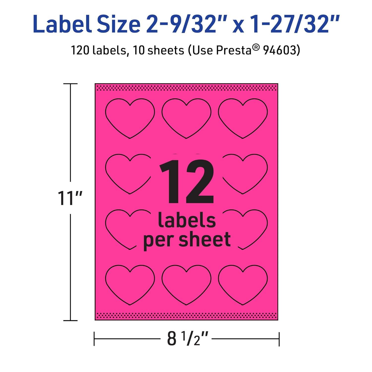 Design your own high-visibility labels with vibrant, bright colors with Avery Neon Magenta Heart 2-9/32″ x 1-27/32″ Labels. Created with brilliantly eye-catching neon magenta label material, these vivid labels will immediately grab people's attention so that you can easily make your own mailing seals, packaging labels, planner stickers, and more! The fluorescent color is perfect whether you need to create warnings, organize inventory, or make sure your product labels stand out on a shelf. Colored labels also help you reduce printing costs by printing with black ink instead of printing color ink on white paper. Compatible with both laser and inkjet printers, these labels make it easy to design professional labels with your own home or office printer. The print-to-the-edge layout allows you to create full-bleed artwork that allows the bright label color to peek through gaps in your design and it also lets you add in borders that fill the edges without any empty spaces. Easily customize product branding labels, packaging seals, decorative labels, and more with your own logos, art, symbols, and messaging by using the templates and designs in Avery Design & Print on the Avery site.
