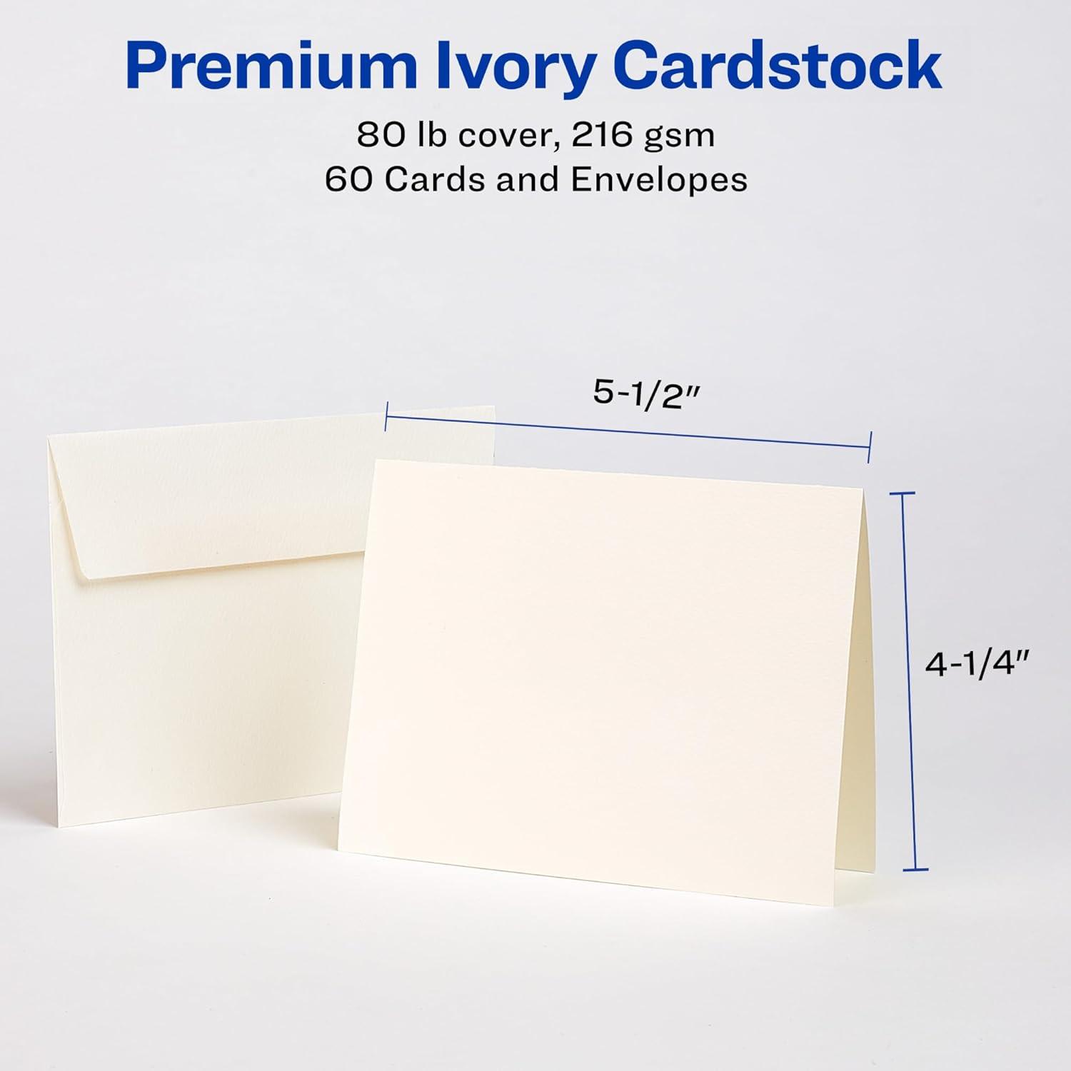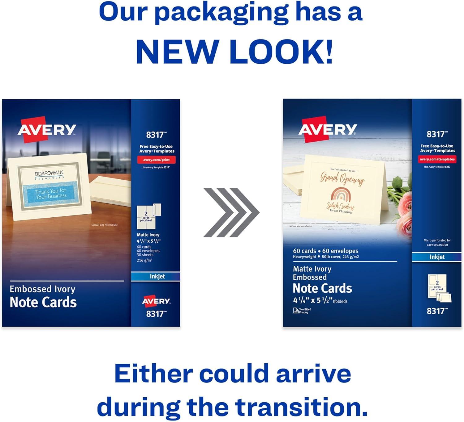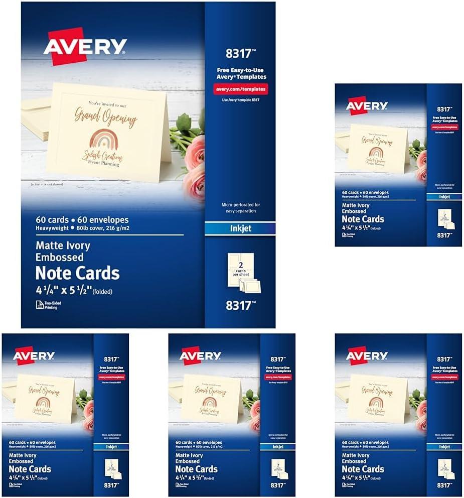 Avery 8317 Note Cards makes it so easy to create your own personalized greeting cards, party invitations, and business marketing collateral that you’ll wonder why you haven’t been doing it all along. Crafted from 80 lbs / 216 gsm heavyweight cardstock, each ivory sheet comes micro-perforated and scored for smooth-edged 4.25″ x 5.5″ note cards that are easy to separate and fold. This pack of 60 note cards also features an embossed border for an elegant, upscale look. For added value, a set of 60 envelopes is also included. Whether you have your own design or you're starting from scratch, Avery Design & Print Online makes it easy to create and print customized cards from your own home or business. The browser-based software has everything you need to design DIY greeting cards, birthday cards, wedding invitation cards, special event invites for your office or small business and more. Try it out today on the Avery website and print on your inkjet printer. Make all your personal events, special occasions and business marketing cards unique and impactful with these customizable note cards.