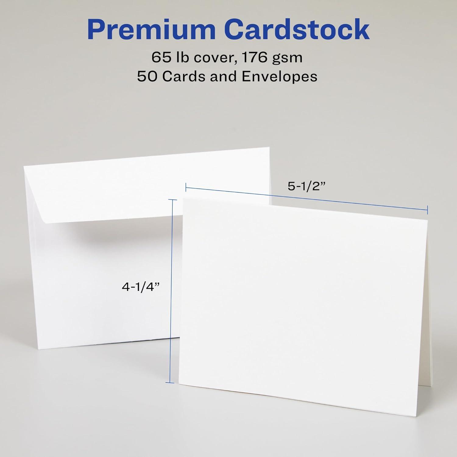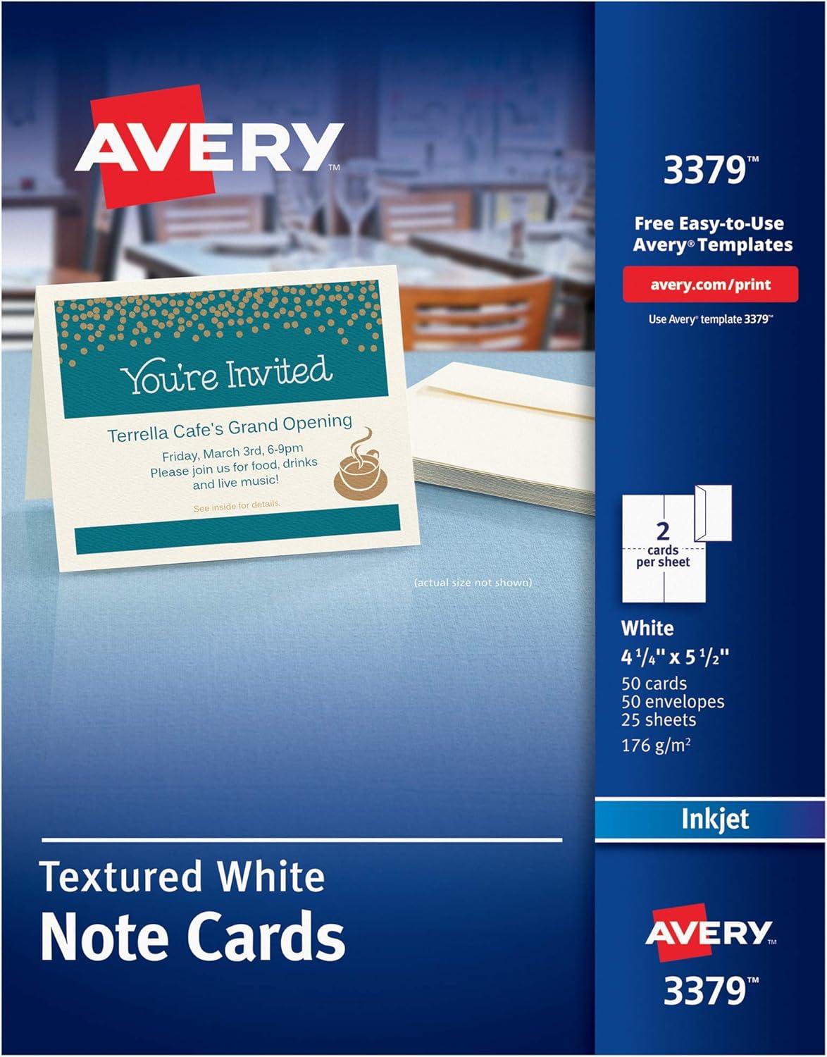 Avery 3379 Note Cards makes it so easy to create your own personalized greeting cards, party invitations, and business marketing collateral that you’ll wonder why you haven’t been doing it all along. Crafted from 65 lbs / 176 gsm heavyweight cardstock for an elegant and upscale look, each textured white sheet comes micro-perforated and scored for smooth-edged 4.25″ x 5.5″ note cards that are easy to separate and fold. For added value, this pack of 50 cards also includes 50 envelopes. Whether you have your own design or you're starting from scratch, Avery Design & Print Online makes it easy to create and print customized cards from your own home or business. The browser-based software has everything you need to design DIY greeting cards, birthday cards, wedding invitation cards, special event invites for your office or small business and more. Try it out today on the Avery website and print on your inkjet printer. Make all your personal events, special occasions and business marketing cards unique and impactful with these customizable note cards.