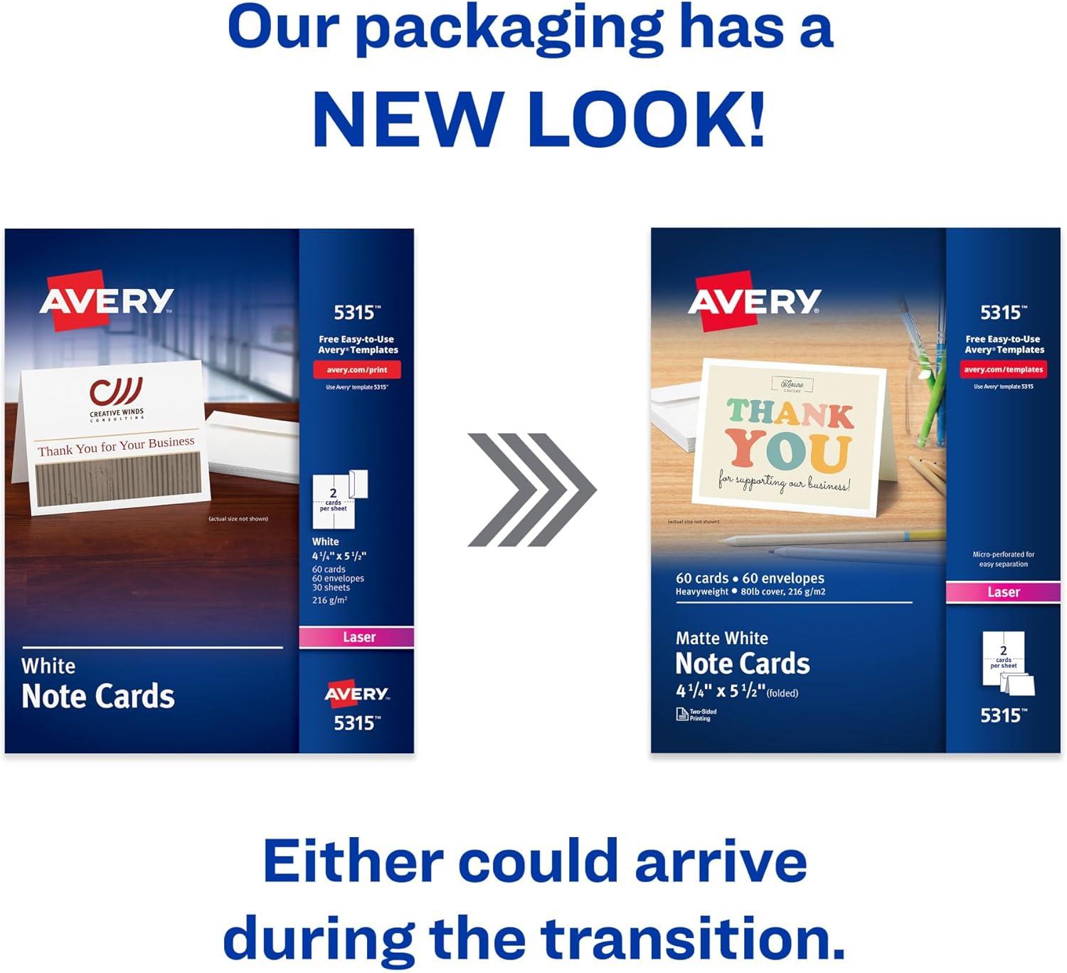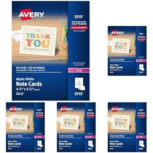 Avery Printable Note Cards with Envelopes, 4.25" x 5.5", White, 60 Blank Note Cards for Laser Printers (05315)(4-1/4 x 5-1/2 Inches (Pack of 5))