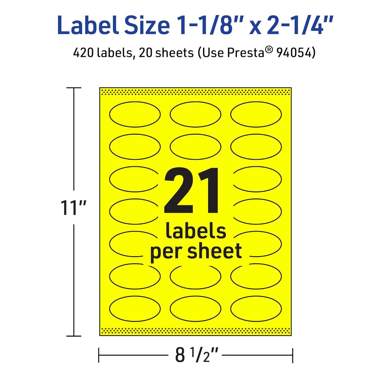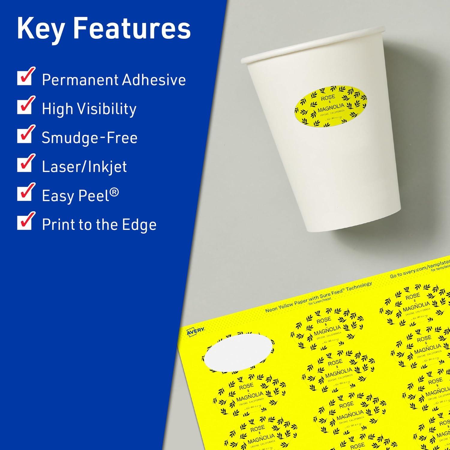 Design your own high-visibility labels with vibrant, bright colors with Avery Neon Yellow Oval 1-1/8″ x 2-1/4″ Labels. Created with brilliantly eye-catching neon yellow label material, these vivid labels will immediately grab people's attention so that you can easily make your own ingredient labels, soap labels, candle labels, and more! The fluorescent color is perfect whether you need to create warnings, organize inventory, or make sure your product labels stand out on a shelf. Colored labels also help you reduce printing costs by printing with black ink instead of printing color ink on white paper. Compatible with both laser and inkjet printers, these labels make it easy to design professional labels with your own home or office printer. The print-to-the-edge layout allows you to create full-bleed artwork that allows the bright label color to peek through gaps in your design and it also lets you add in borders that fill the edges without any empty spaces. Easily customize product labels, canning labels, packaging labels, and more with your own logos, art, symbols, and messaging by using the templates and designs in Avery Design & Print on the Avery site.