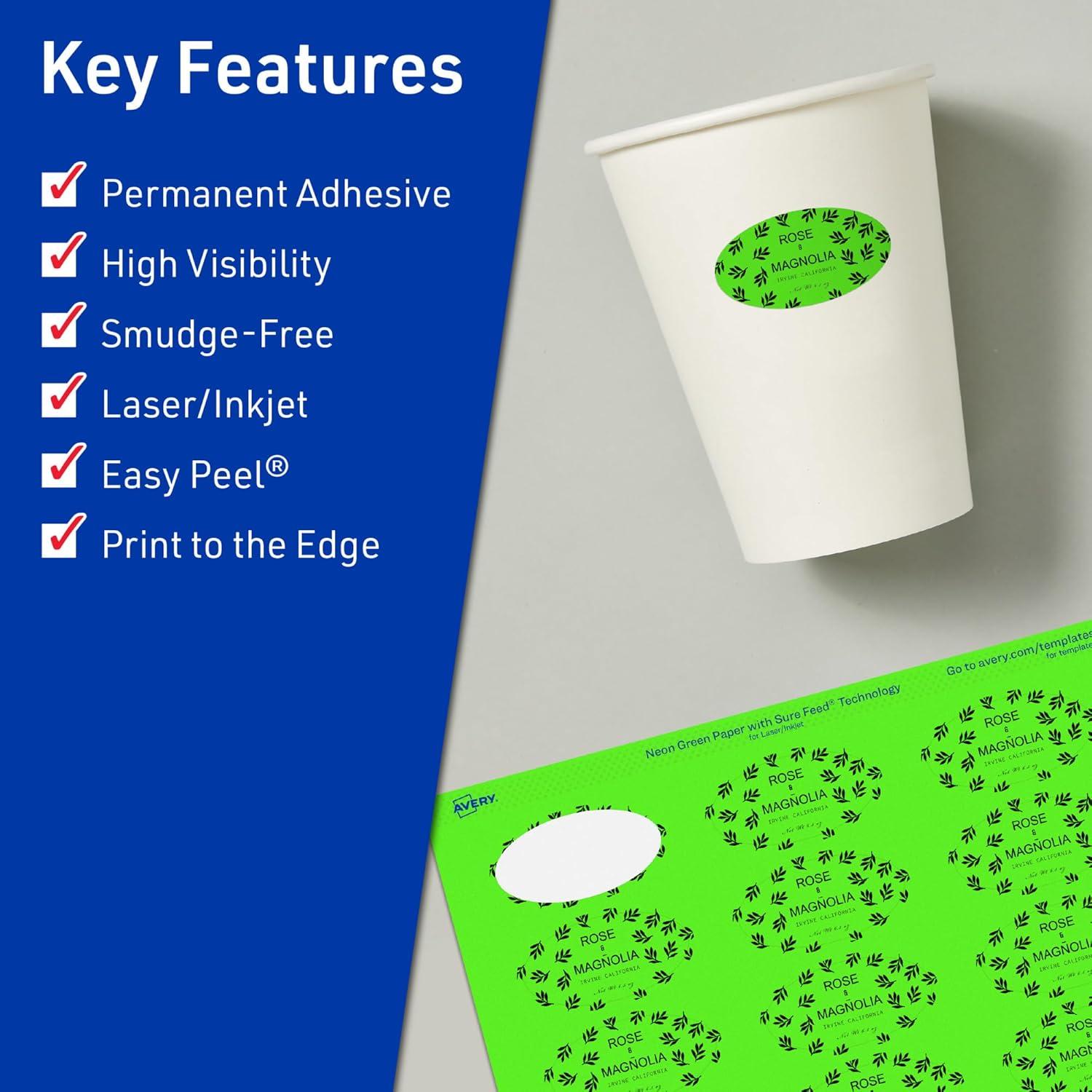 Avery Printable Oval Labels, Sure Feed Technology, 1″ x 2″, Neon Green Labels, Print-to-The-Edge, Laser/Inkjet Printable, 960 Total, Great for Soaps and Candles(480 labels)