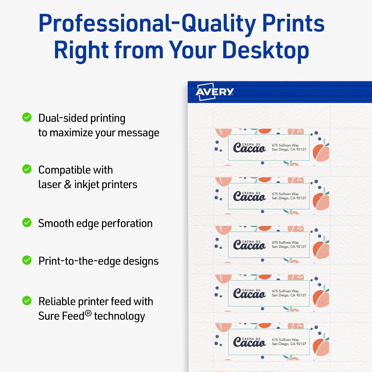 Print with confidence: Avery Business Cards featuring Sure Feed technology provides a more reliable feed through your printer, helping to reduce misalignments and printer jams