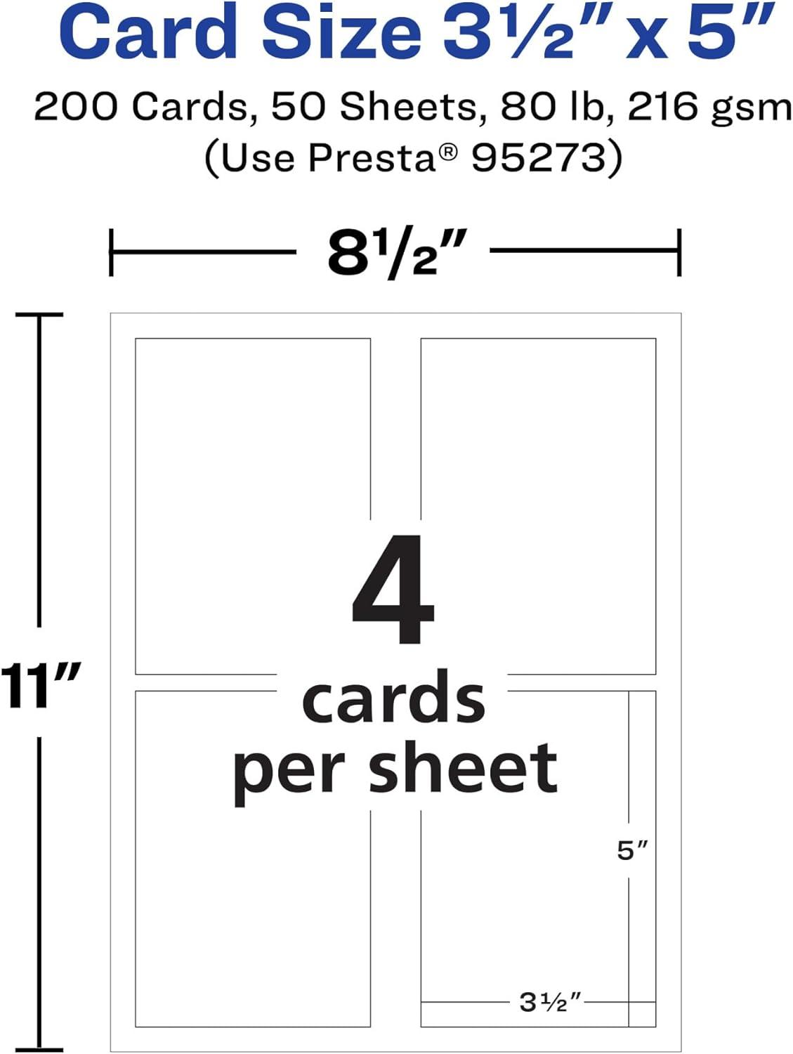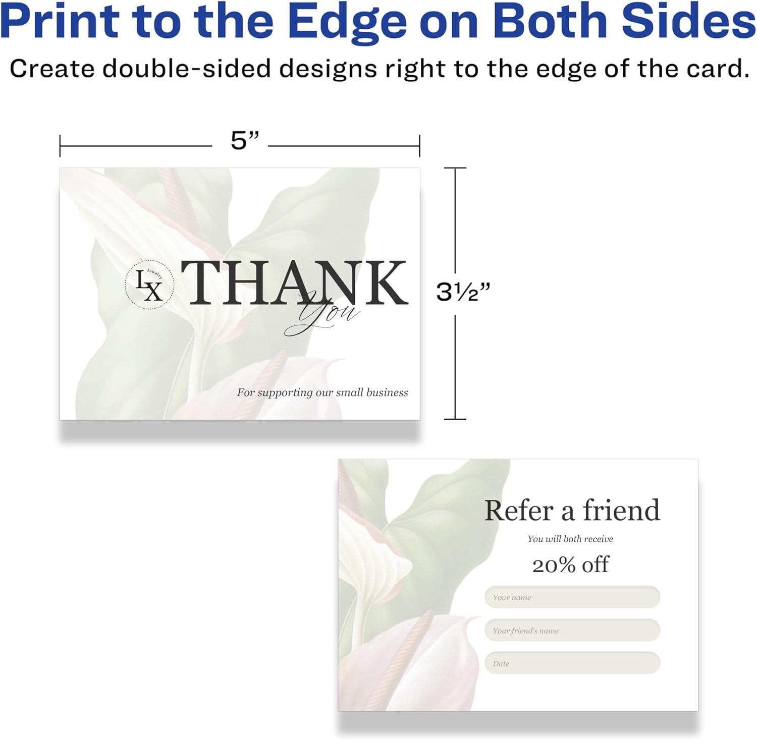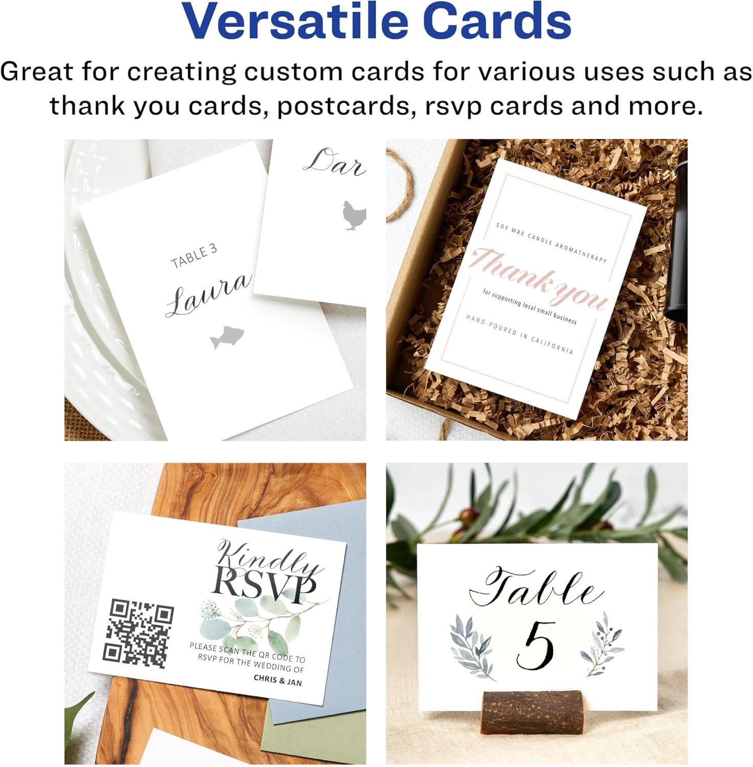 Easily create your own postcards, index cards, thank you cards, holiday cards, menu cards, RSVP cards, promotional pieces, and more with Avery Matte White Rectangle Cards. Compatible with USPS size and thickness requirements, Avery postcards are durable enough to be mailable while also being the perfect size for a variety of other uses. Created with heavyweight and durable 80lb / 216 gsm cardstock, the smooth matte material is a versatile fit for any project or event. Printable on both sides and compatible with laser and inkjet printers, the matte white cards let you create professional designs with a desktop printer. Avery cards are carefully constructed with patented features to provide the best results. The print-to-the-edge layout lets you print all the way to the edge of the card. Microperforated with a series of precise cuts, just fold and tear away to leave behind a soft border without any jagged edges. Easily customize cards with your own logos, art, symbols, and messaging by using the templates and designs in Avery Design & Print. Printable on both sides, these cards make it easy to show different information on the front and back. For best results, use the card setting on your printer and feed one sheet at a time. Whether you’re a business owner that wants to add more flair to products, a party organizer trying to elevate an event, or a teacher looking to step up class projects, Avery rectangle cards make it easy to translate your designs into reality.