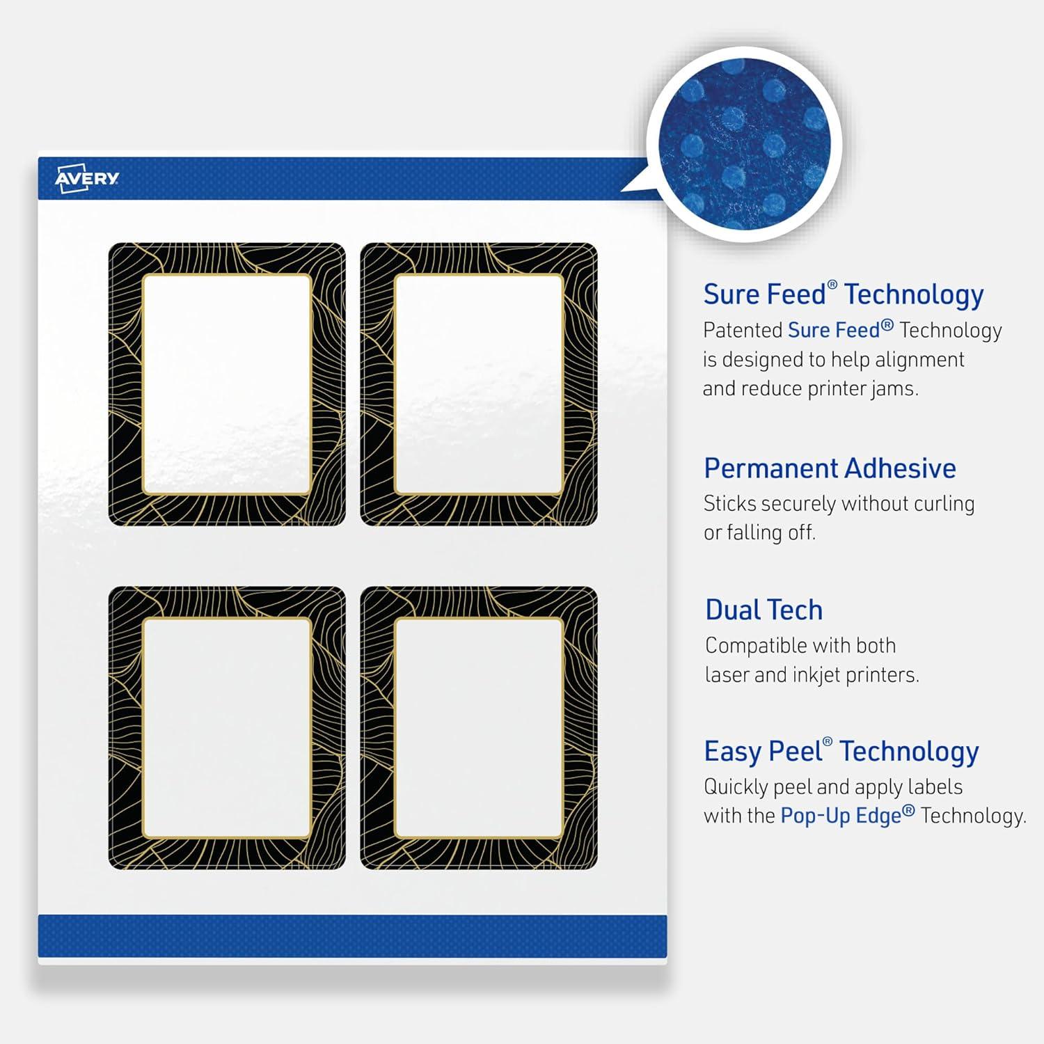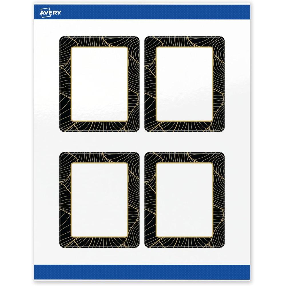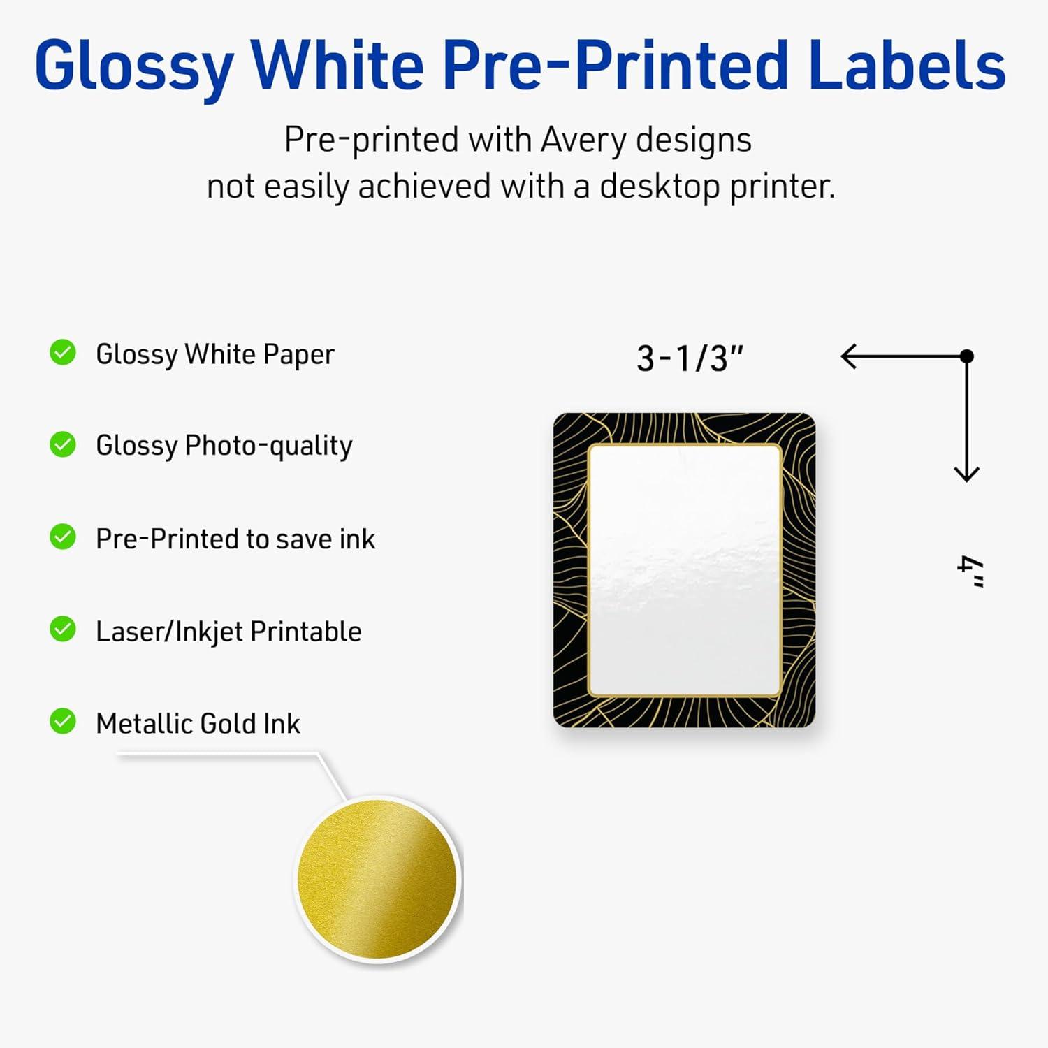 Avery Printable Rectangle Labels, Gold Dots, Blue Border, 4" x 3-1/3", Glossy White Rectangle Labels, Permanent, Laser/Inkjet, 40ct, Great for Product Merchandising(Black Border With Gold Veins)