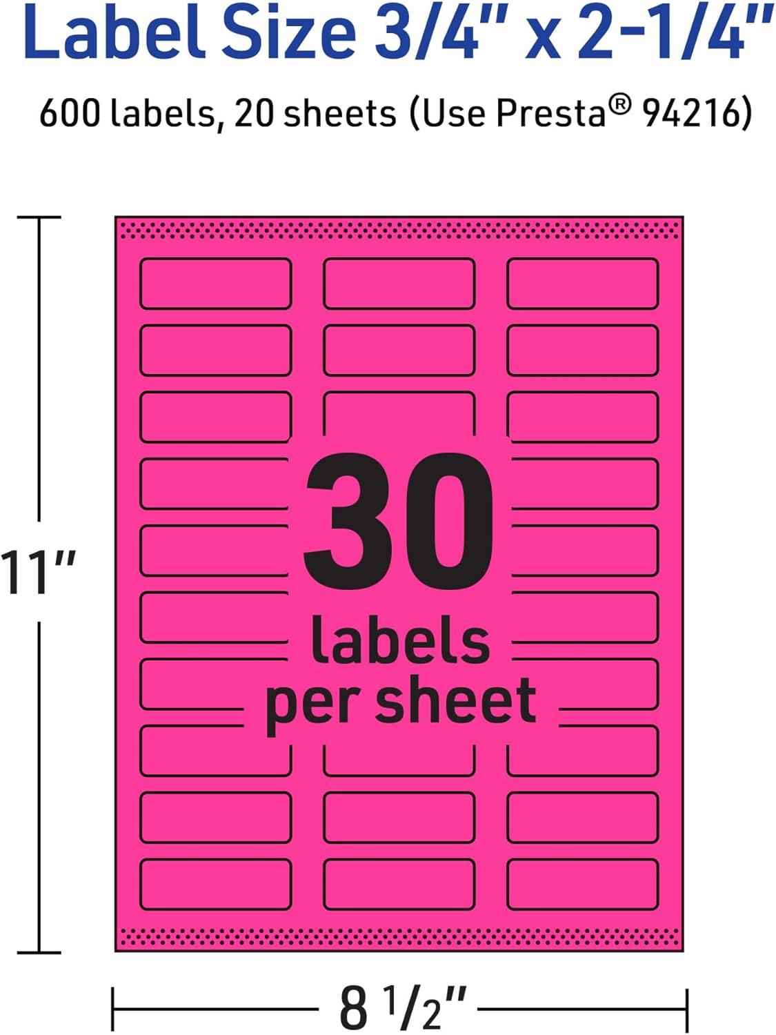 Avery Printable Rectangle Labels, Sure Feed Technology, 3/4″ x 2-1/4″, Neon Magenta Labels, Print-to-The-Edge, Laser/Inkjet Printable, 1,200 Total, Great for Mailing(600 labels)