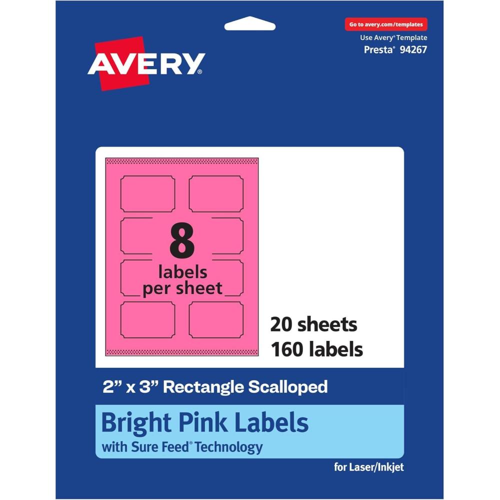 Avery Printable Rectangle Scalloped Labels, Sure Feed Technology, 2″ x 3″, Bright Pink Labels, Print-to-The-Edge, Laser/Inkjet Printable, 80 Total, Great for Mailing and Candles(320 labels)