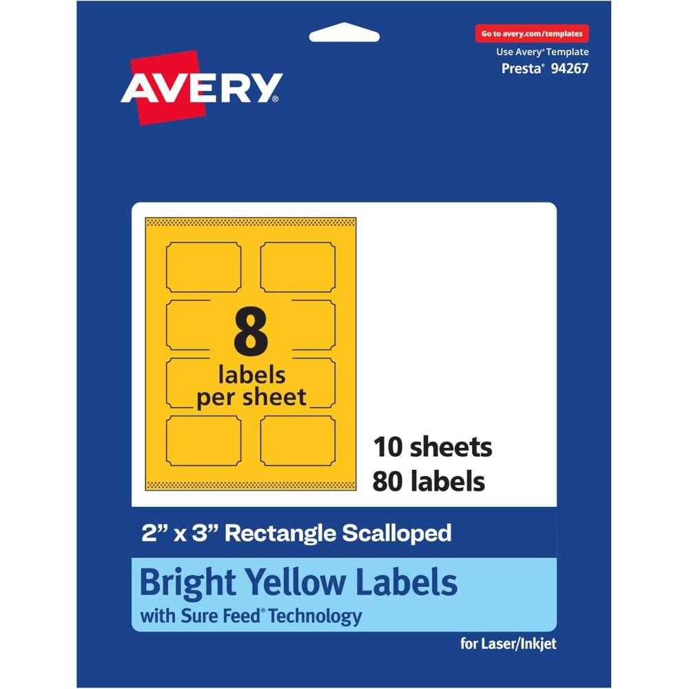 Be the first to review “Avery Printable Rectangle Scalloped Labels, Sure Feed Technology, 2″ x 3″, Bright Yellow Labels, Print-to-The-Edge, Laser/Inkjet Printable, 80 Total, Great for Mailing and Candles(80 labels)”