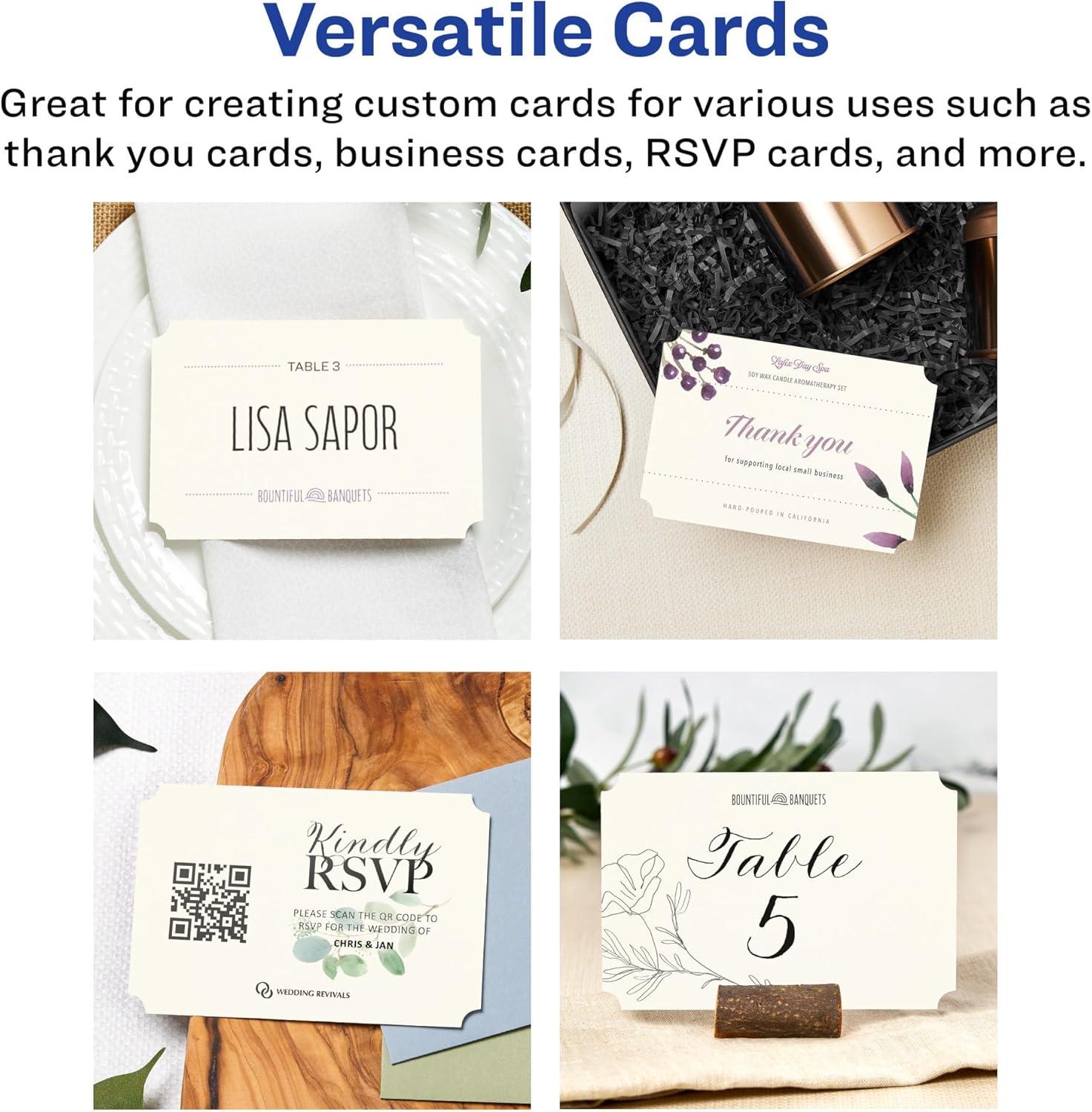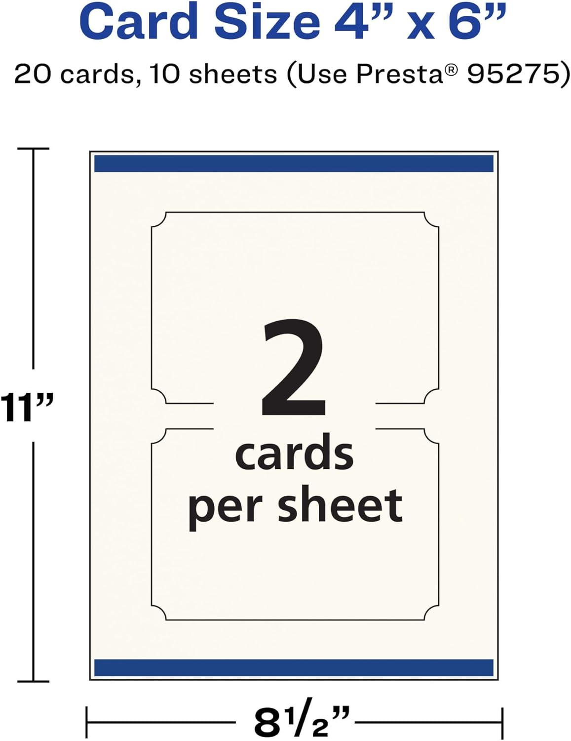 Easily create your own customized cards with Avery Ivory 4″ x 6″ Rectangle Scalloped Cards. Enhance save the date cards, invitation cards, thank you cards, and more with the high-quality appearance of Avery premium ivory cardstock. The versatile card size meets USPS size and thickness requirements for postcards while also being great for promotional mailers, product insert cards, announcement cards, table cards, and more. Created with heavyweight and durable 80lb / 216GSM ivory cardstock, the ivory material is a versatile fit for any project or event. Printable on both sides, compatible with laser and inkjet printers, and featuring a print-to-the-edge layout, the cards let you create professional designs that let you print all the way to the edge. Avery rectangle scalloped cards are carefully constructed with patented features to provide the best results. Sure Feed technology reduces jams or smudges by creating a more reliable feed through your printer. Easily customize cards with your own logos, art, symbols, and messaging by using the templates and designs in Avery Design & Print on the Avery site.