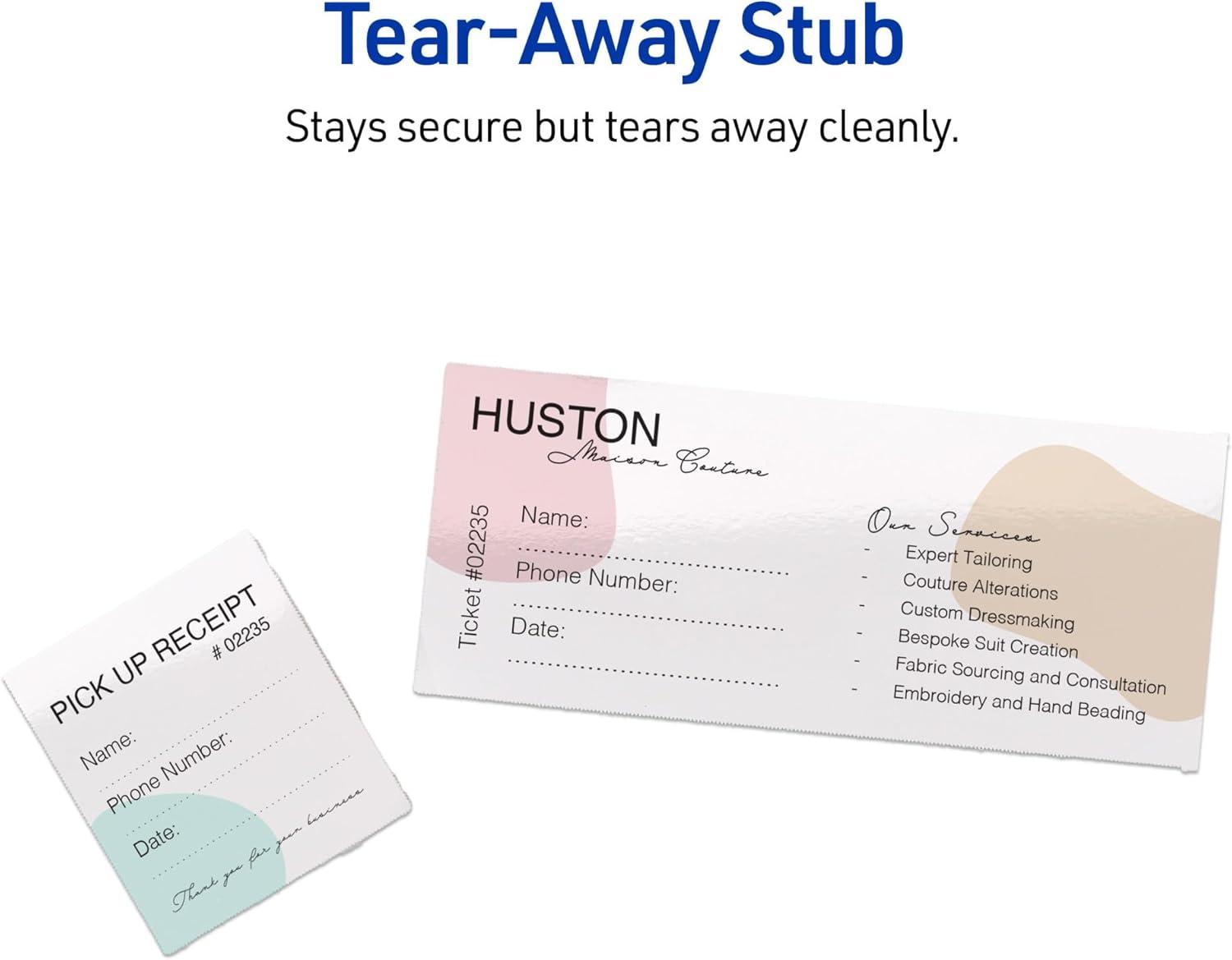 Easily create and print your own raffle tickets, lottery tickets, coupons, and more with Avery 1.75″ x 5.5″ glossy white rectangle tickets. Make custom movie tickets, tickets for events, drink tickets, meal tickets, festival tickets, and more with pre-scored, tearaway stubs. Created with heavyweight and durable 83 lb / 227 gsm cardstock, the glossy white material is a versatile fit for any project or event. Printable on both sides and compatible with laser and inkjet printers, the tickets let you create professional designs with a desktop printer. Avery rectangle tickets are carefully constructed with useful features to provide the best results. Easily customize tickets with your own logos, art, symbols, and messaging by using the templates and designs in Avery Design & Print on the Avery site. Whether you’re a business owner that wants to add more flair to products, a party organizer trying to elevate an event, or a teacher looking to step up class projects, Avery tickets make it easy to translate your designs into reality.