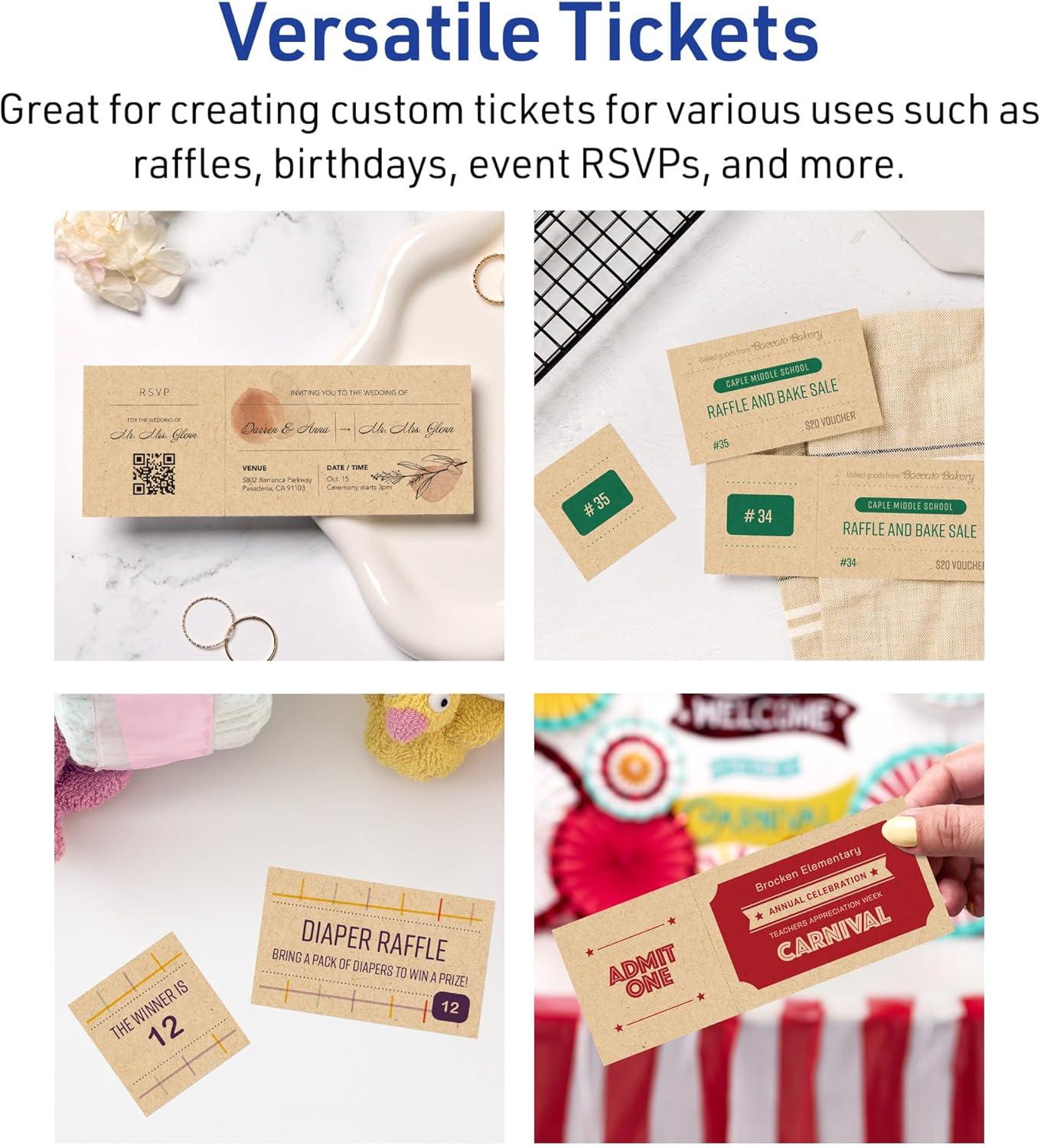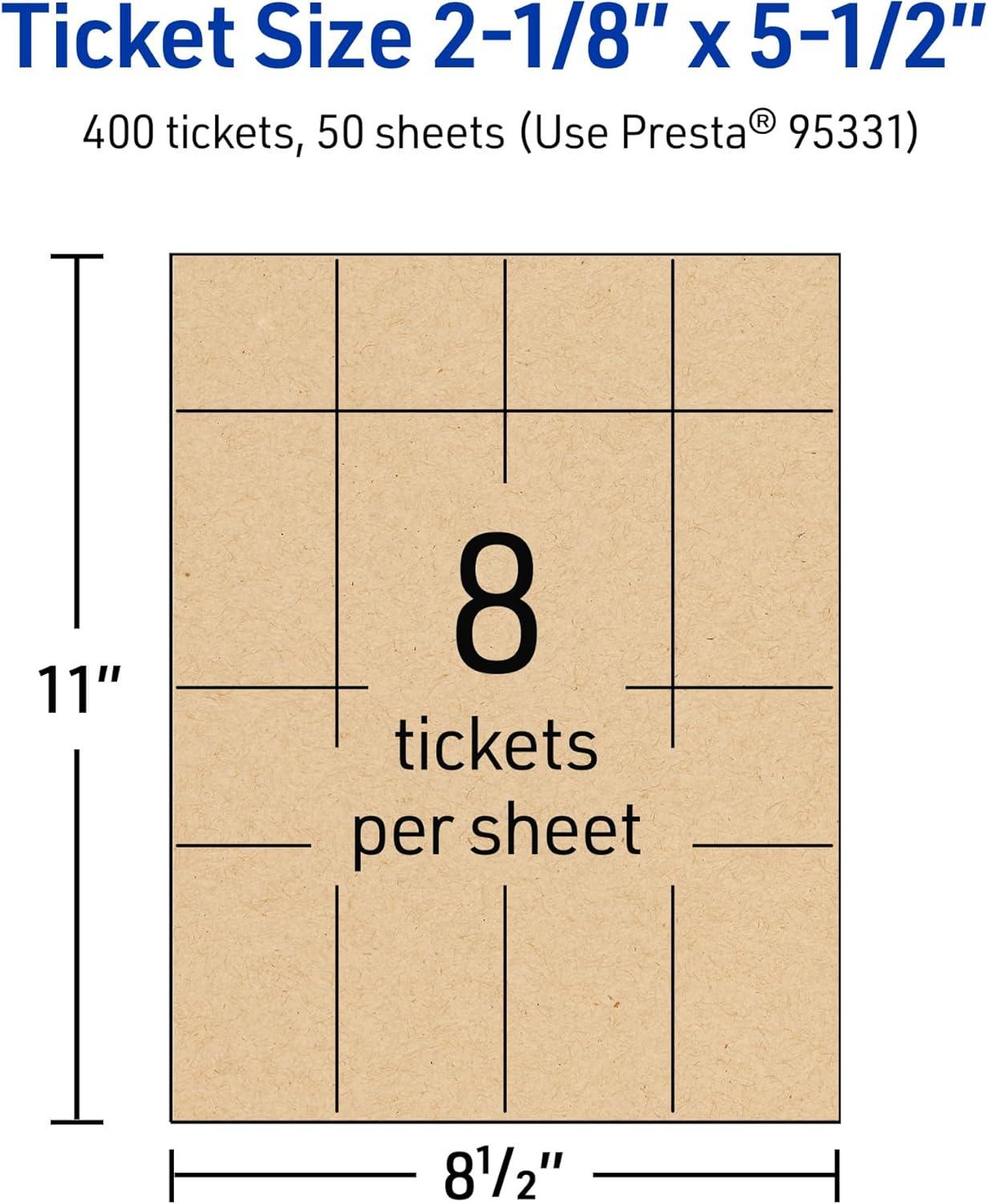 Easily create and print your own raffle tickets, lottery tickets, coupons, and more with Avery 2-1/8″ x 5.5″ kraft brown rectangle tickets. Make custom movie tickets, tickets for events, drink tickets, meal tickets, festival tickets, and more with pre-scored, tearaway stubs. Created with heavyweight and durable 80 lb / 216 gsm cardstock, the kraft brown material is a versatile fit for any project or event. Printable on both sides and compatible with laser and inkjet printers, the tickets let you create professional designs with a desktop printer. Avery rectangle tickets are carefully constructed with useful features to provide the best results. Easily customize tickets with your own logos, art, symbols, and messaging by using the templates and designs in Avery Design & Print on the Avery site. Whether you’re a business owner that wants to add more flair to products, a party organizer trying to elevate an event, or a teacher looking to step up class projects, Avery tickets make it easy to translate your designs into reality.