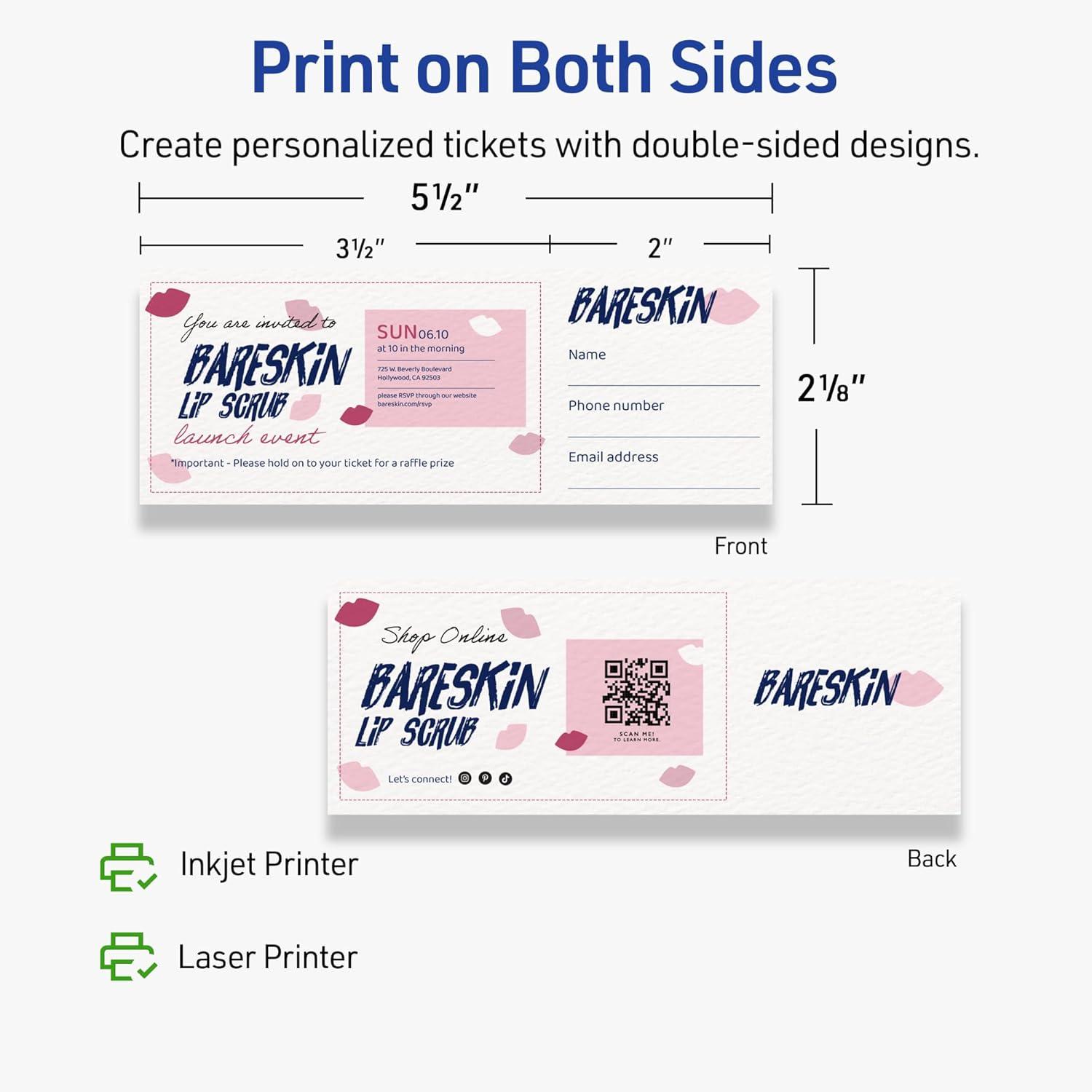 Elevate every design: Create next-level tickets for events and celebrations, birthday party invitations, surprise announcements, and more with full-color printing on both sides of each blank ticket