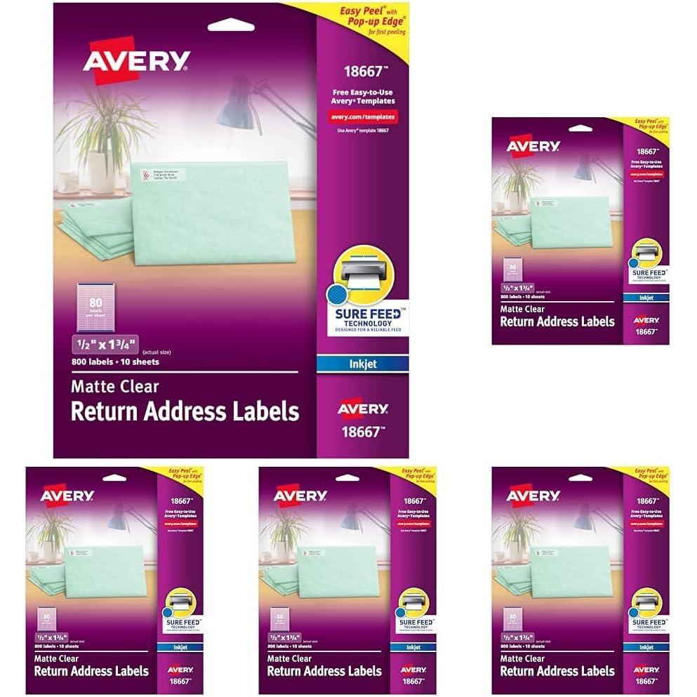Avery Printable Return Address Labels with Sure Feed, 0.5" x 1.75", Matte Clear, 800 Blank Mailing Labels (18667)(1/2 in. X 1-3/4 in. (Pack of 5))