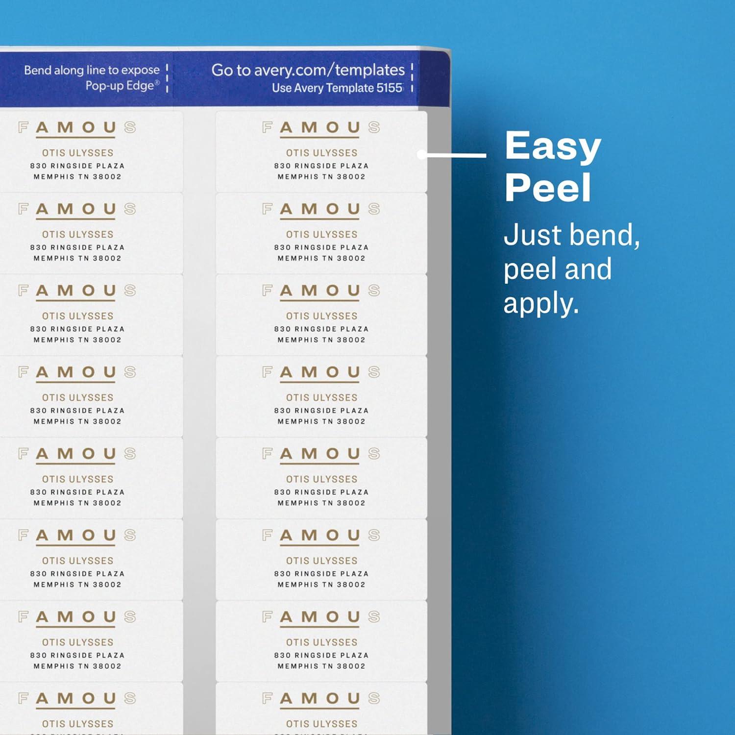 Create professional-looking labels quickly with Easy Peel Mailing Labels. For fast peeling, bend the label sheets to expose the Pop-up Edge. Bright white labels have permanent adhesive and are jam-free and smudge-free. Each delivers sharp print quality that is perfect for creating labels for addressing, shipping and organizing. Perforated letter-size sheets tear so the edge of each self-adhesive label hangs over the sheet backing for easy access. Labels are compatible with laser printers. Avery offers many easy-to-use templates for Microsoft Word and other popular software programs.