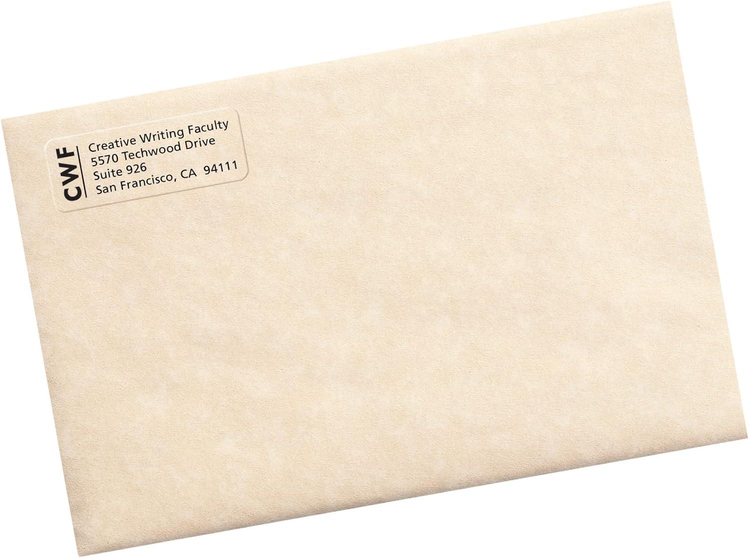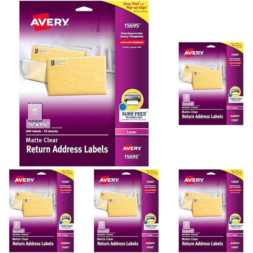 Do your envelopes and packages need a shot of sophistication? This pack of 600 Avery Matte Clear Return Address Labels is the clear solution to sprucing up ordinary mailing and packaging. These matte clear labels virtually disappear when applied to white, textured or light-colored paper. Use these clear labels on glassine bags and vellum envelopes to create a perfect, printed-on appearance. These labels also feature exclusive Avery Sure Feed technology to improve print alignment and avoid jamming. The blue, textured strip on the top of each sheet provides better grip for printer rollers and helps feed the sheet through your printer. Ultrahold permanent adhesive ensures that these labels stick and stay without curling, peeling or falling off. Once applied, the permanent adhesive will make sure the label holds fast to multiple surfaces including paper, cardboard, plastic, glass, film and painted metals. The patented Easy Peel label design makes these clear mailing labels easy to peel and quick to apply. Just bend the label sheet, peel off your labels and fold the sheet back flat. These easy-to-use Avery mailing labels make it simple to personalize your envelopes and shipping boxes with an elegant flair. Avery Design & Print also makes it effortless to create beautiful, personalized labels from your own home or business. The Avery browser-based software has everything you need to design address labels, invitations, product packaging and more. Try it out today on the Avery site Please Note: These labels are optimized for use with laser printers only. Using these sheets with inkjet printers may cause the print to smear.