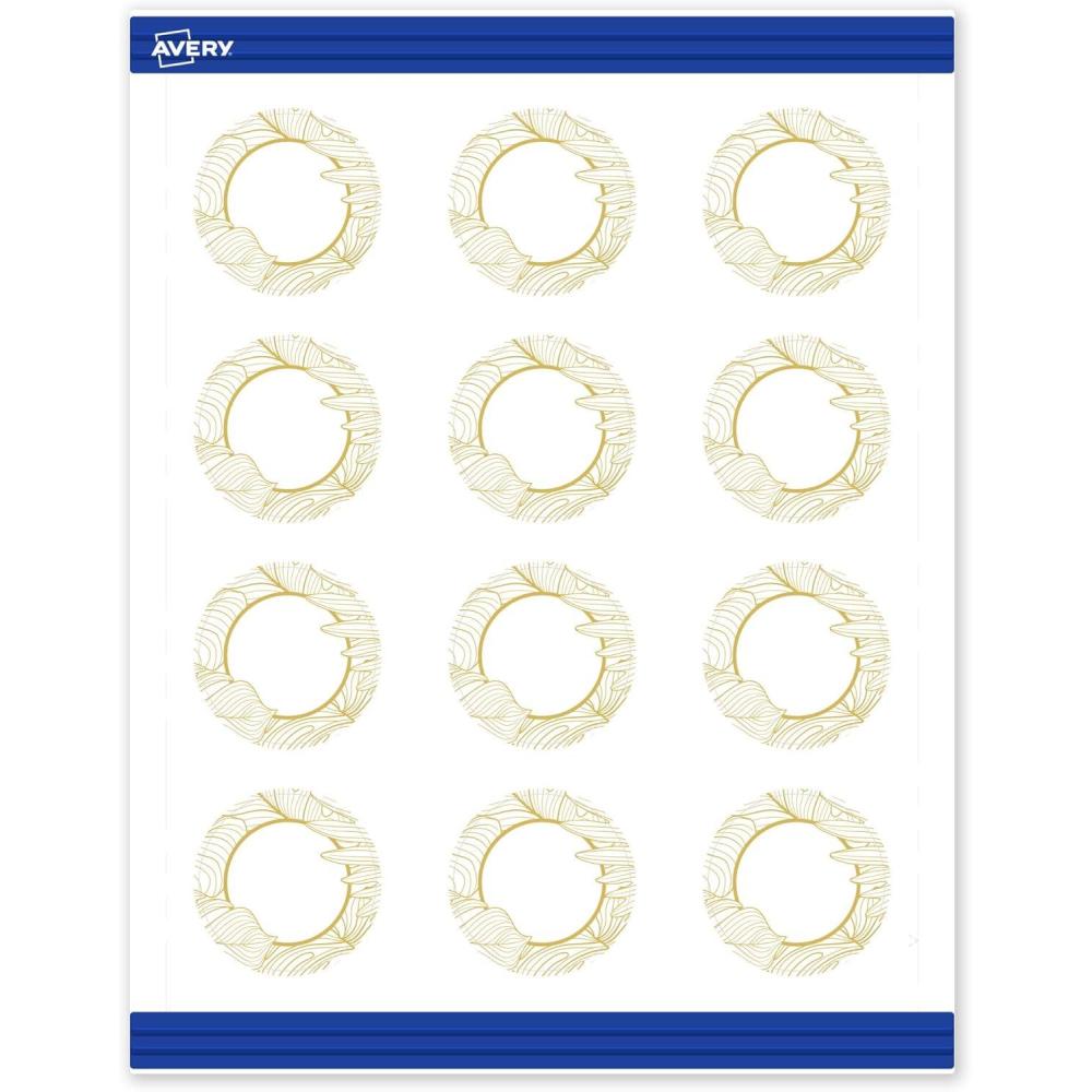 Pre-printed with beautiful designs, Avery Round 2″ Diameter Matte White Cards with the Blue Border with Gold Dots Design help save ink and also elevate your branding and events. Pre-designed and printed with metallic gold ink with high-quality printers, these shiny patterns will definitely stand out and are not easily achieved with desktop printers. These pre-printed embellishments also help save your printer ink so that you only need to print your customizable information. Mix and match these cards with other Avery products from the same collection that have the same pre-printed design to create a cohesive look. Made with durable 80 lbs / 216 gsm cardstock with microperforated edges, these cards are great for creating double-sided thank you cards, round printable cards, round notes, and more. The versatile matte white material is a great solution for any project. Sure Feed technology reduces printer jams by creating a more reliable feed through your printer. Easily customize gold wedding cards, luxury holiday event cards, premium event cards, festive gold cards, and more with your own logos, text, and designs by searching for the Presta ID S00-D2H and using the templates and tools in Avery Design & Print on the Avery site.