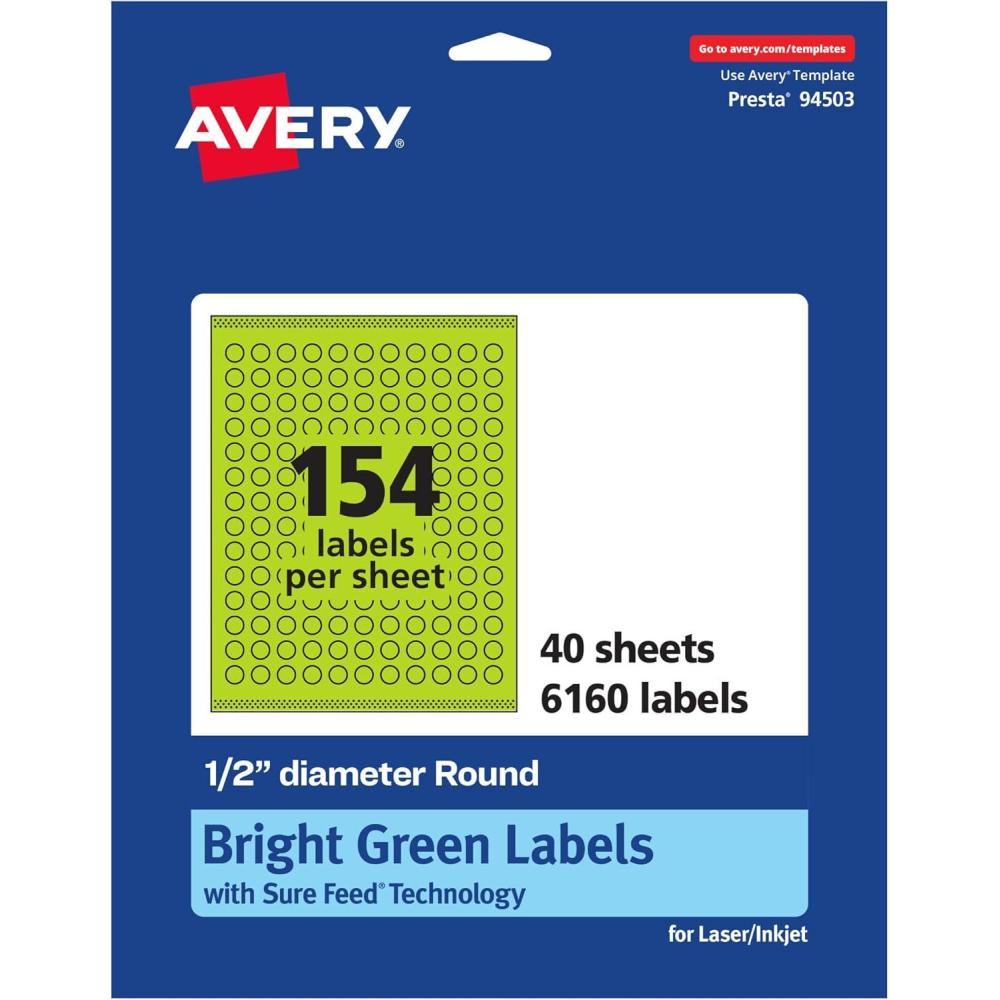 Avery Printable Round Labels, Sure Feed Technology, 1/2" Diameter, Bright Green Labels, Print-to-The-Edge, Laser/Inkjet, 1,540 Total, Great for Price Stickers and Mailing Seals(6 160 labels)