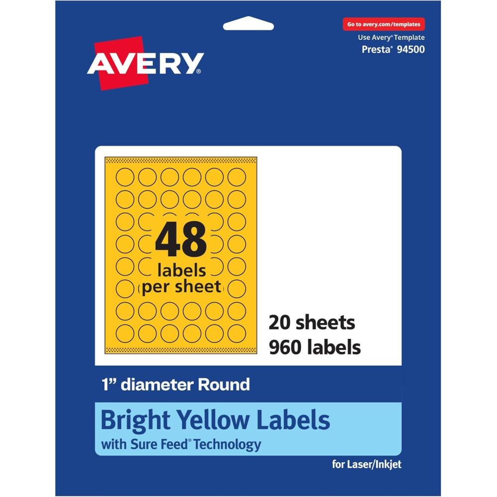 Avery Printable Round Labels, Sure Feed Technology, 1″ Diameter, Bright Yellow Labels, Print-to-The-Edge, Laser/Inkjet, 480 Total, Great for Price Stickers and Mailing Seals(960 labels)