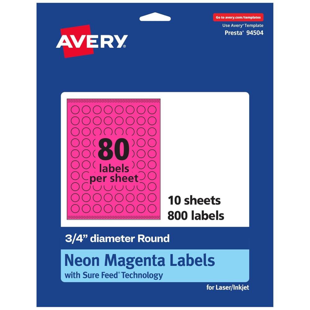 imageAvery Printable Round Labels Sure Feed Technology 34quot Diameter Neon Magenta Labels PrinttoTheEdge LaserInkjet 3200 Total Great for Price Stickers and Mailing Seals800 labels